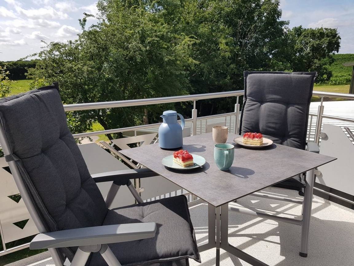 Diese im Juli 2022 fertiggestellte Wohnung mit 53 qm Wohnfläche im Obergeschoss und einem Balkon Richtung Westen ist für 2 - 4 Personen geeignet. Sie verfügt über ein Schlafzimmer mit Doppelbett, ein Bad mit großer Dusche und beheiztem Handtuchhalter, sowie eine geschmackvoll eingerichtete Diele. Es erwartet Sie eine voll ausgestattete Küche mit großzügigem Essbereich, in der Sie mit Freude köstliche Menüs anrichten können. Die offene Küche geht über in einen kommodigen Wohnbereich mit direktem Zugang zum Balkon, auf dem Sie gemütliche Stühle mit Tisch und Sonnenschirm zum Entspannen finden. Der Wohnraum verfügt über ein Smart TV, ein Digitalradio sowie über eine Couch mit integriertem Matratzenbett (140x200) und bietet somit den Schlafplatz 3+4. Ausdrucksvolle Fototapeten im Wohn- und Schlafzimmer geben dieser Wohnung ihren sehr individuellen Charme. Die Böden im Bad, in der Küche und im Wohnbereich sind mit hochwertigen Steinfliesen und Fußbodenheizung ausgestattet. Dank einer integrierten Be- und Entlüftungsanlage ist stets ein angenehmes Raumklima vorhanden. Im gemeinschaftlichen Hauswirtschaftsraum stehen Ihnen Waschmaschine, Trockner, Spüle, Akkustaubsauger, Bügelbrett und Mineralwasser kostenfrei zur Verfügung.Die Vermietung der Ferienwohnungen erfolgt ausschließlich zu touristischen Zwecken.Die Aufnahme von Monteuren oder die Nutzung der Wohnungen zu gewerblichen Zwecken ist nur nach vorheriger Absprache möglich. Die Wohnungen werden, ebenfalls nach vorheriger Absprache, an max. 1 bis 2 Personen pro Wohnung vermietet. Bei längeren Aufenthalten wird wöchentlich eine Zwischenreinigung zu den aktuellen Konditionen durchgeführt.