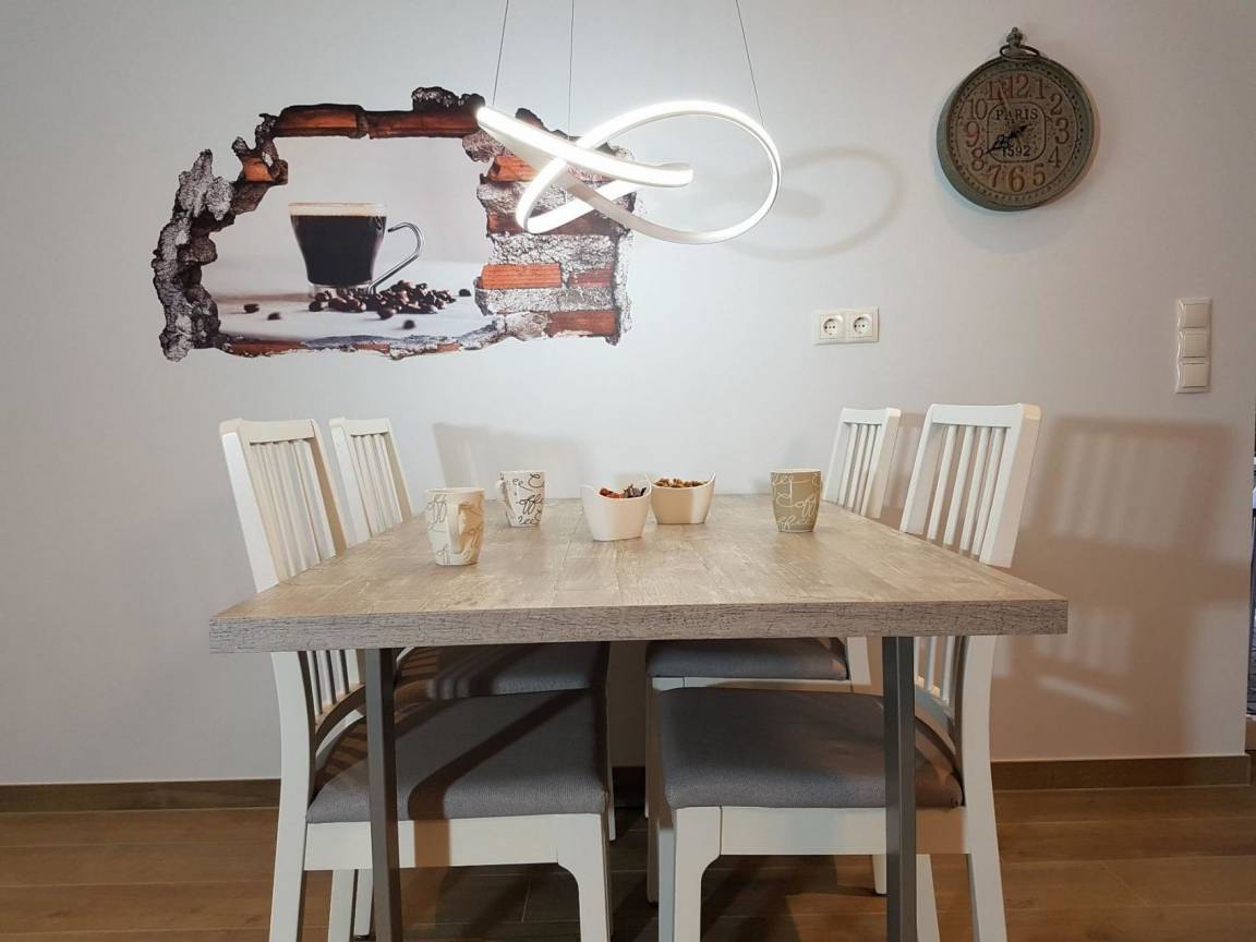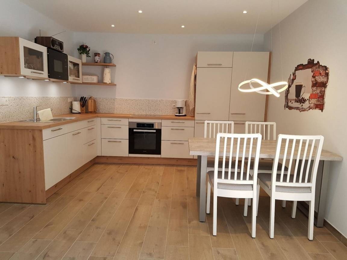 Diese im Juli 2022 fertiggestellte Wohnung mit 53 qm Wohnfläche im Erdgeschoss und einer Terrasse Richtung Westen ist für 2 - 4 Personen geeignet. Sie verfügt über ein Schlafzimmer mit Doppelbett, ein Bad mit großer Dusche und beheiztem Handtuchhalter, sowie eine geschmackvoll eingerichtete Diele. Es erwartet Sie eine voll ausgestattete Küche mit großzügigem Essbereich, in der Sie mit Freude köstliche Menüs anrichten können. Die offene Küche geht über in einen kommodigen Wohnbereich mit direktem Zugang zur Terrasse, auf der Sie gemütliche Stühle mit Tisch zum Entspannen finden. Der Wohnraum verfügt über ein Smart TV, ein Digitalradio sowie über eine Couch mit Schlaffunktion (120x200) und bietet somit den Schlafplatz 3+4. Ausdrucksvolle Fototapeten im Wohn- und Schlafzimmer geben dieser Wohnung ihren sehr individuellen Charme. Die Böden im Bad, in der Küche und im Wohnbereich sind mit hochwertigen Steinfliesen und Fußbodenheizung ausgestattet. Dank einer integrierten Be- und Entlüftungsanlage ist stets ein angenehmes Raumklima vorhanden. Im gemeinschaftlichen Hauswirtschaftsraum stehen Ihnen Waschmaschine, Trockner, Spüle, Akkustaubsauger, Bügelbrett und Mineralwasser kostenfrei zur Verfügung.Die Vermietung der Ferienwohnungen erfolgt ausschließlich zu touristischen Zwecken.Die Aufnahme von Monteuren oder die Nutzung der Wohnungen zu gewerblichen Zwecken ist nur nach vorheriger Absprache möglich. Die Wohnungen werden, ebenfalls nach vorheriger Absprache, an max. 1 bis 2 Personen pro Wohnung vermietet. Bei längeren Aufenthalten wird wöchentlich eine Zwischenreinigung zu den aktuellen Konditionen durchgeführt.