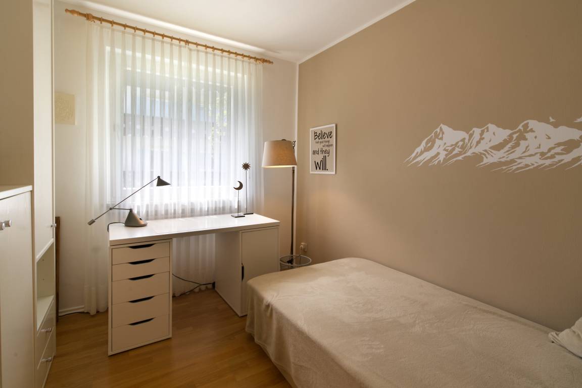 Zwei großzügige Schlafzimmer mit Doppelbetten und ein drittes Schlafzimmer mit Einzelbett bieten genügend Variationsmöglichkeiten zum Schlafen. Dieses dritte Zimmer kann mit dem Schreibtisch auch als Arbeitszimmer/ Büro dienen.
