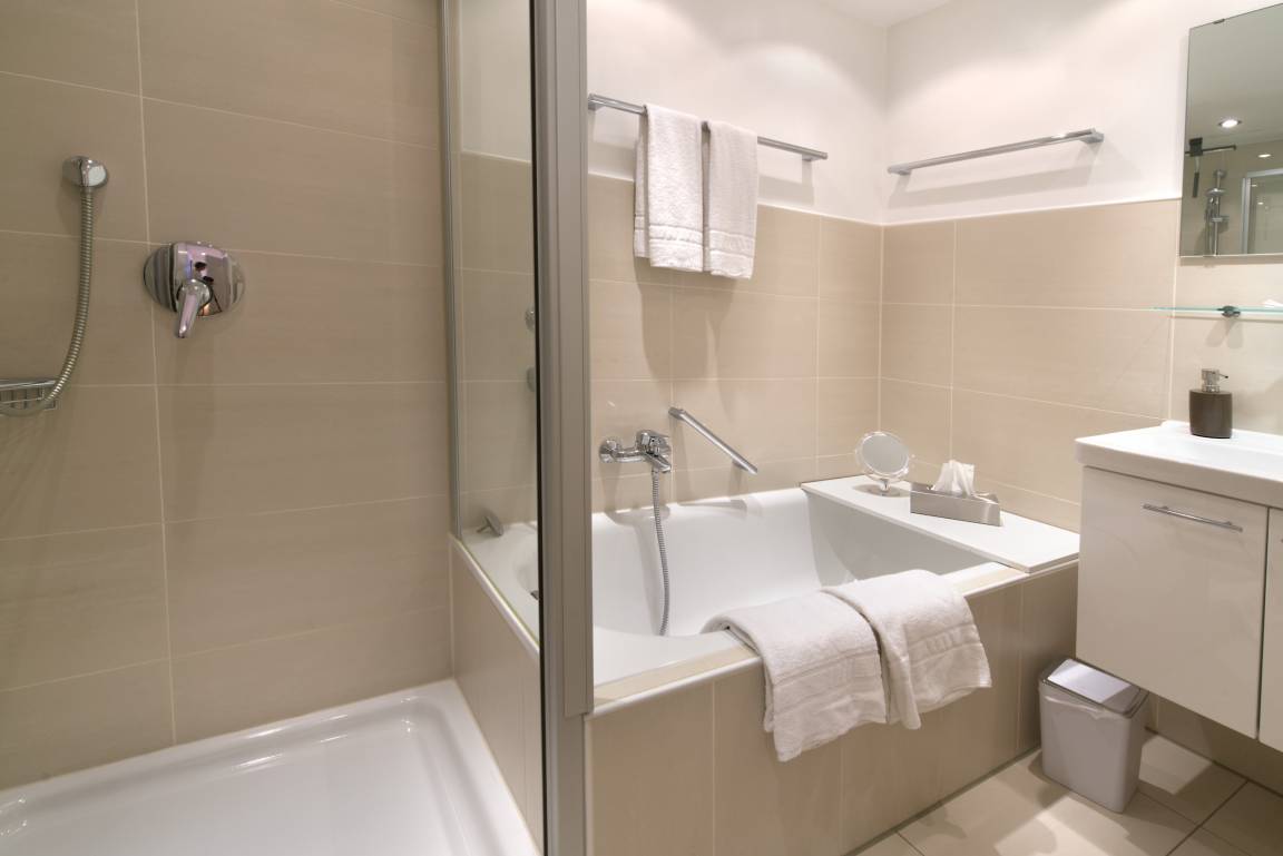 Bad mit Badewanne und Duschkabine. Das WC ist separat.