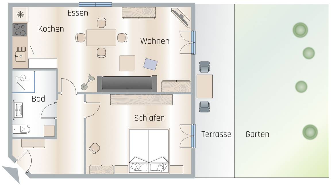 2 Zimmer-Wohnung (57 qm) im Parterre mit großer Terrasse.