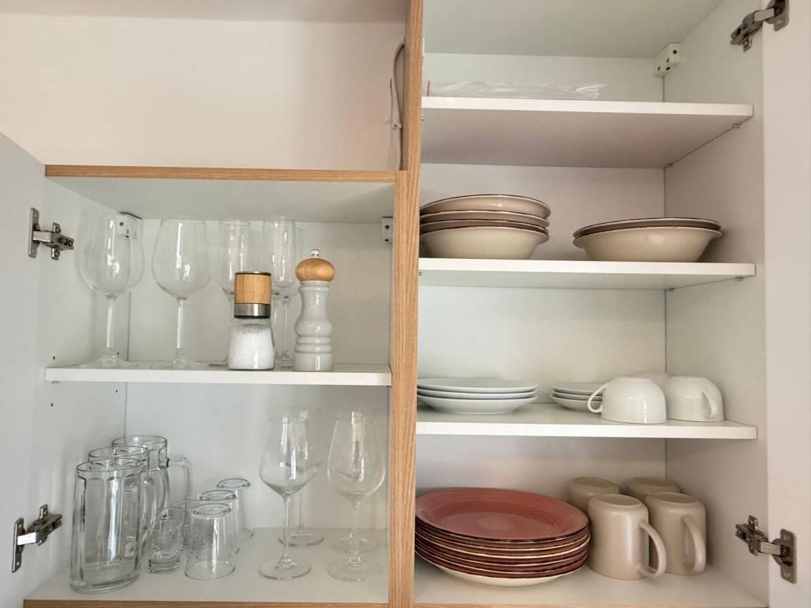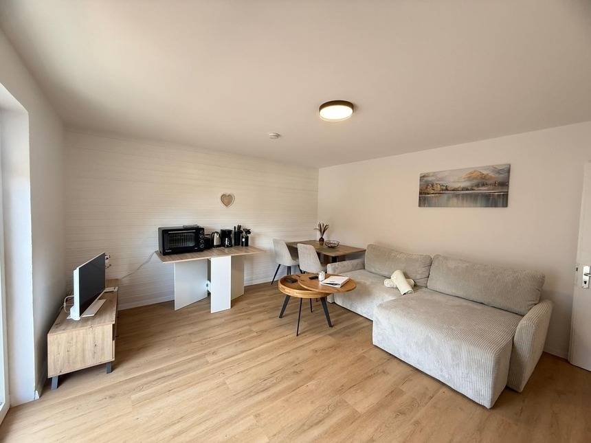 Das gemütliche Schlafzimmer lädt zu erholsamen Nächten ein, während das große Badezimmer mit moderner Dusche für frische Momente sorgt. Der offene Wohnraum vereint Küche, Ess- und Wohnbereich und schafft so eine helle und freundliche Umgebung, in der Sie sich sofort zuhause fühlen. Die Küche ist vollständig ausgestattet und bietet Ihnen alles, was Sie benötigen – statt eines klassischen Herds steht Ihnen ein moderner Minibackofen zur Verfügung, mit dem Sie genauso vielseitig braten, grillen und backen können wie mit einem herkömmlichen Backofen.