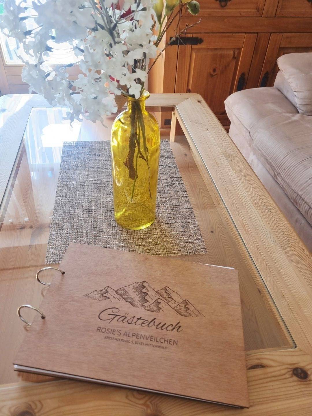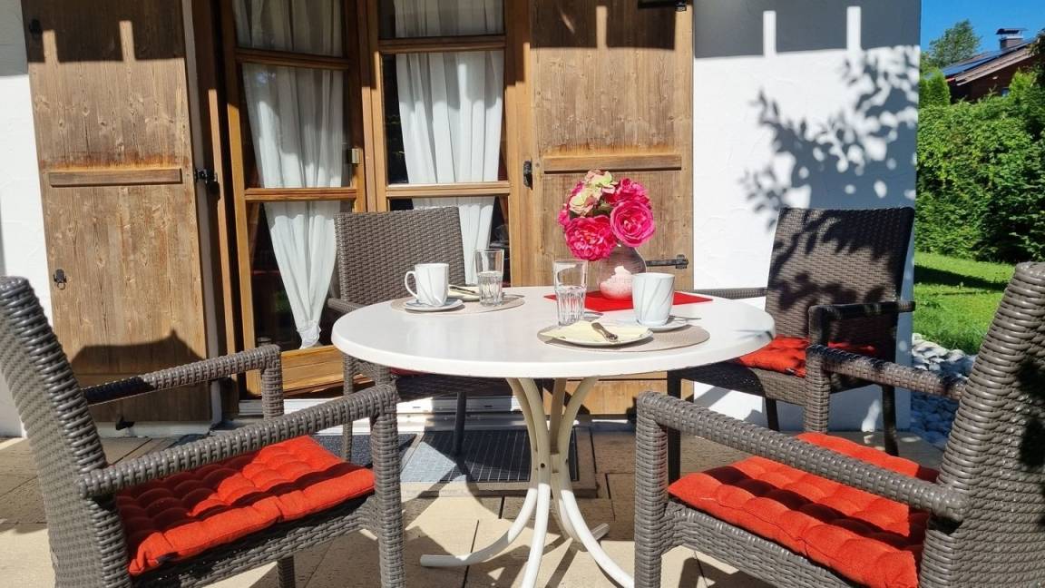 Die geschmackvoll eingerichtete Ferienwohnung "Alpenveilchen" lädt mit ihrer großen zur Westseite hin orientierten Terrasse zum ausruhen in der Abendsonne ein.
