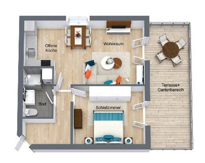 2 Zimmer-Wohnung (57 qm) im Parterre mit großer Terrasse.