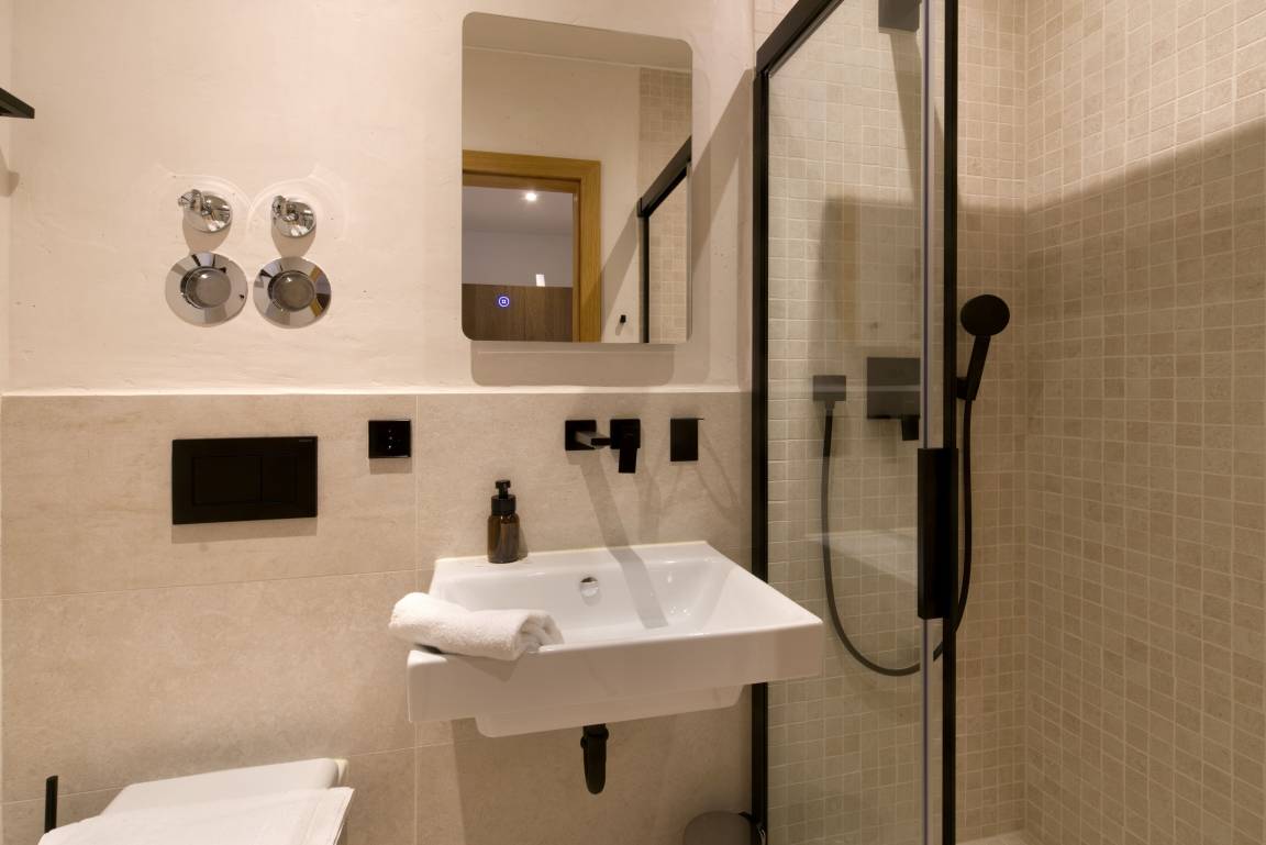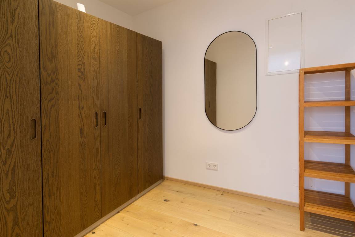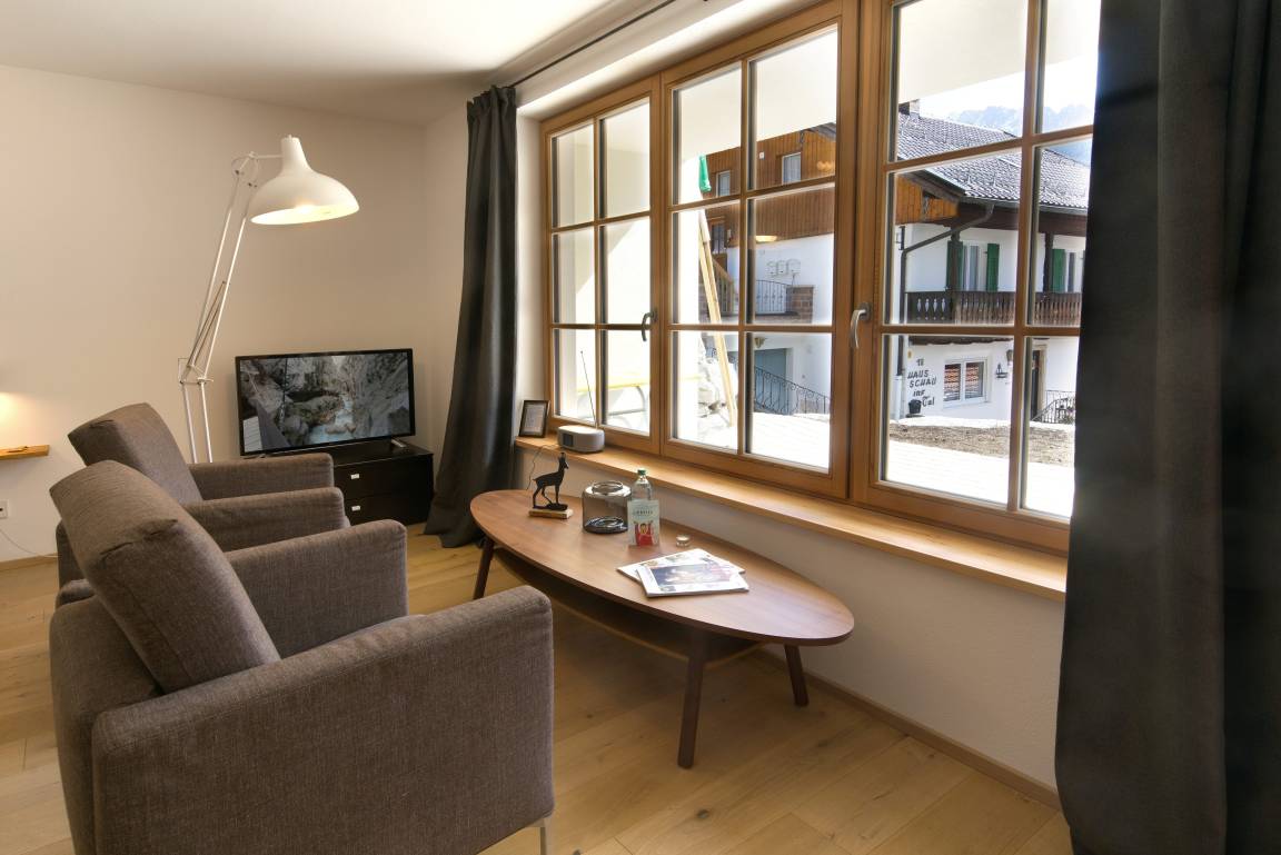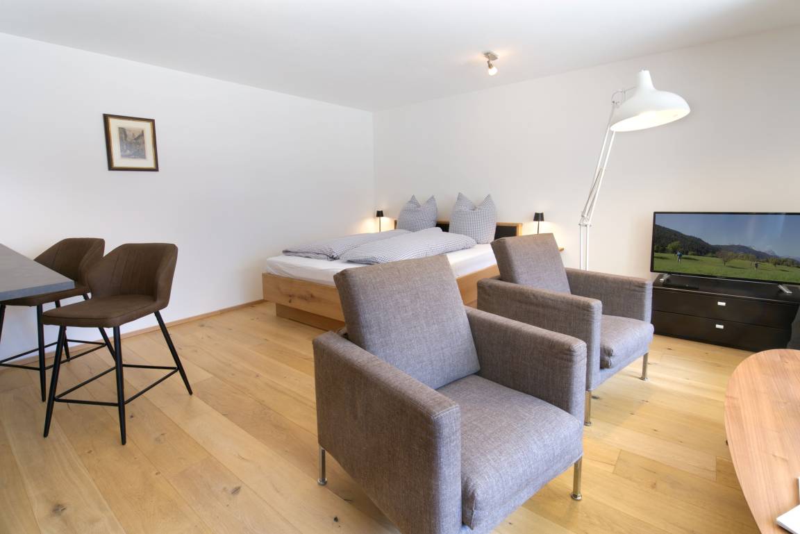 Die hochwertig im modernen Alpinstil eingerichtete Wohnung verfügt über einen offenen, großzügigen Wohn- Schlafraum mit Panoramafenster und zwei gemütlichen Sesseln für die Musestunden, sowie einen Flachbild-TV. Das Boxspringbett 160/200cm ergänzt das Angebot. Die gut ausgestatte Einbauküche mit Kühl-/ Gefrierkombination und Spülmaschine ist über Eck gebaut und umfasst somit auch den Essbereich mit Barstühlen. Der hochwertige Eichen- Dielenboden ist mit einer Fussbodenheizung bestückt. Über einen Vorraum mit Ablagemöglichkeiten und einen Kleiderschrank gelangt man zur Nasseinheit mit ebenerdiger Dusche/WC mit Waschbecken.