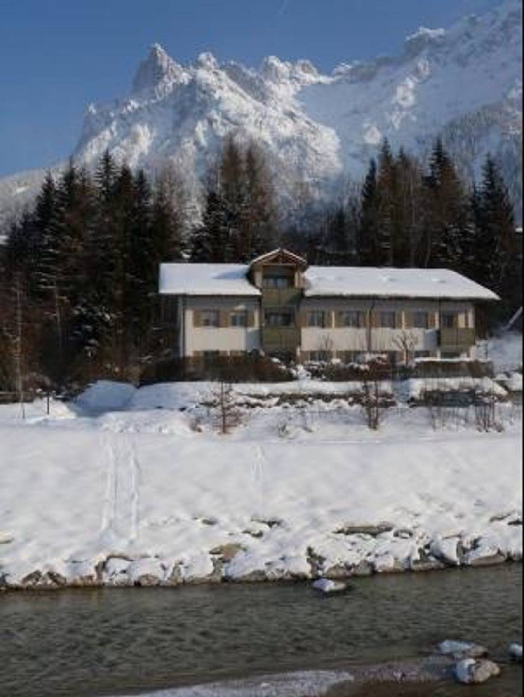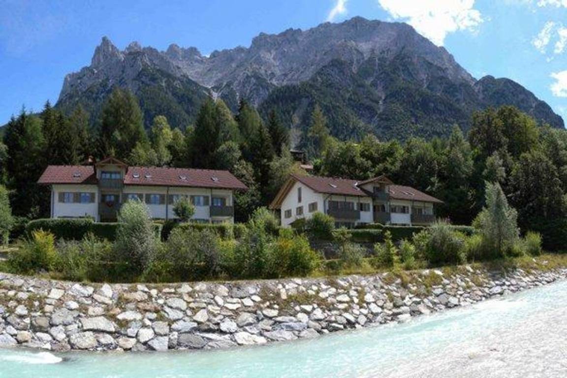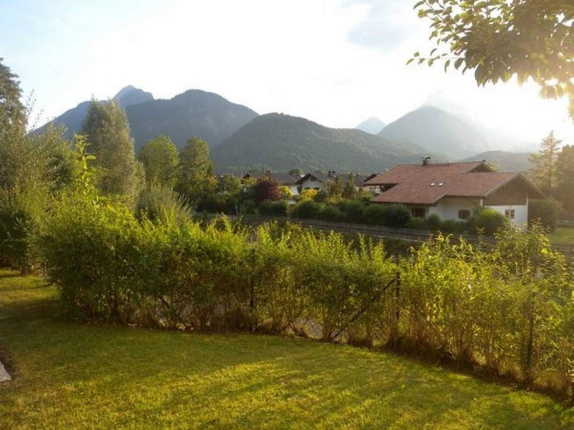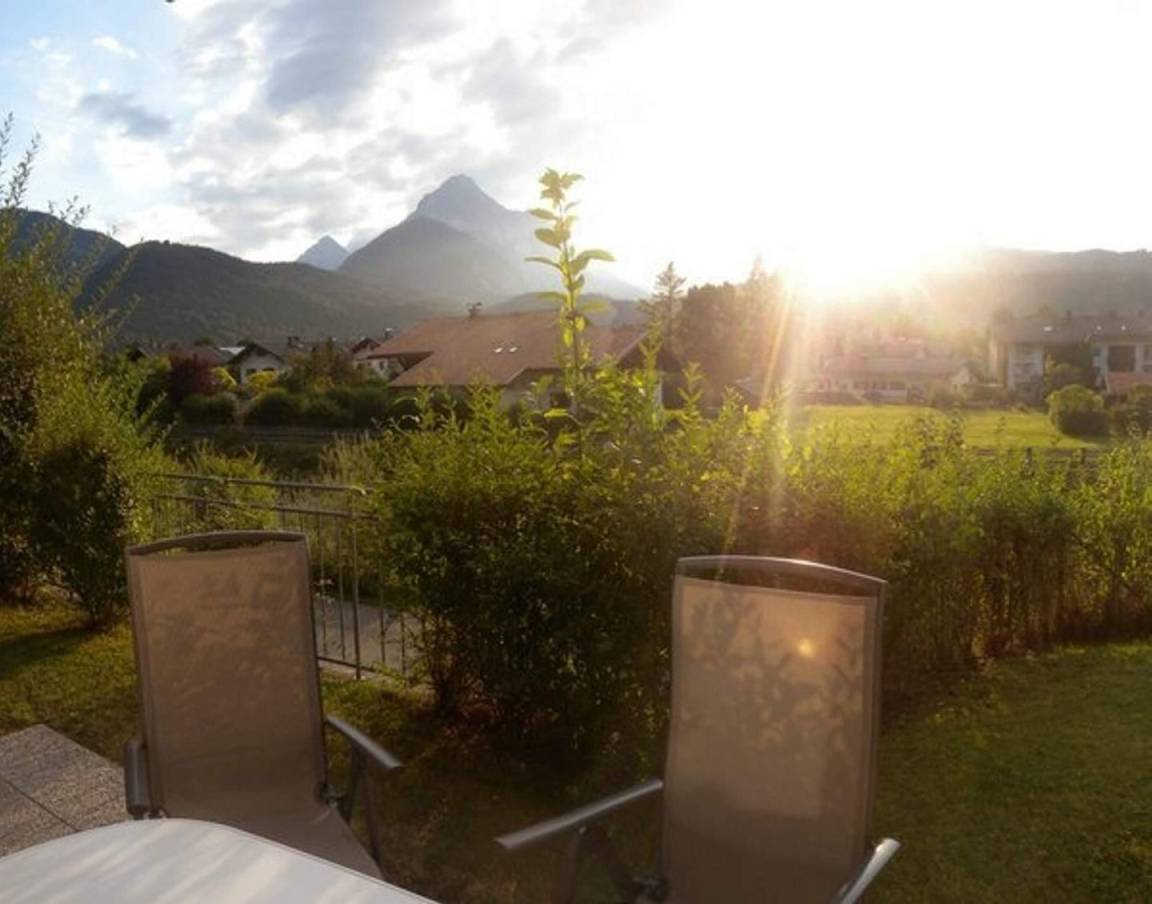Haus Am Rain 7 - Ferienwohnung Sonnenblume für 2 - 6 Personen, Parterre mit Terrasse und kleinem Gartenanteil. Schönes Haus in wunderbar ruhiger und sonniger Lage mit idyllischem Ausblick auf die Isar, auf Mittenwald sowie das Kranzberggebiet mit dem Wetterstein im Hintergrund.