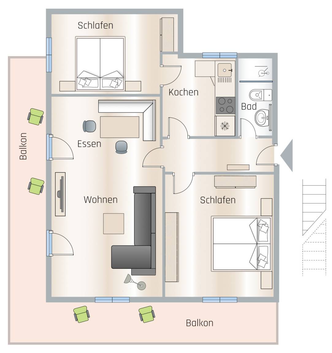 72 m² Ferienwohnung ∙ 2 Schlafzimmer ∙ 3 Gäste