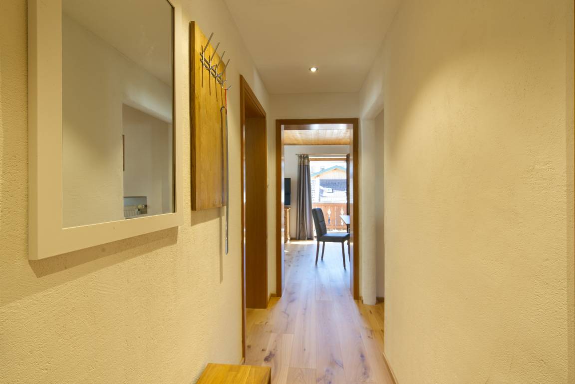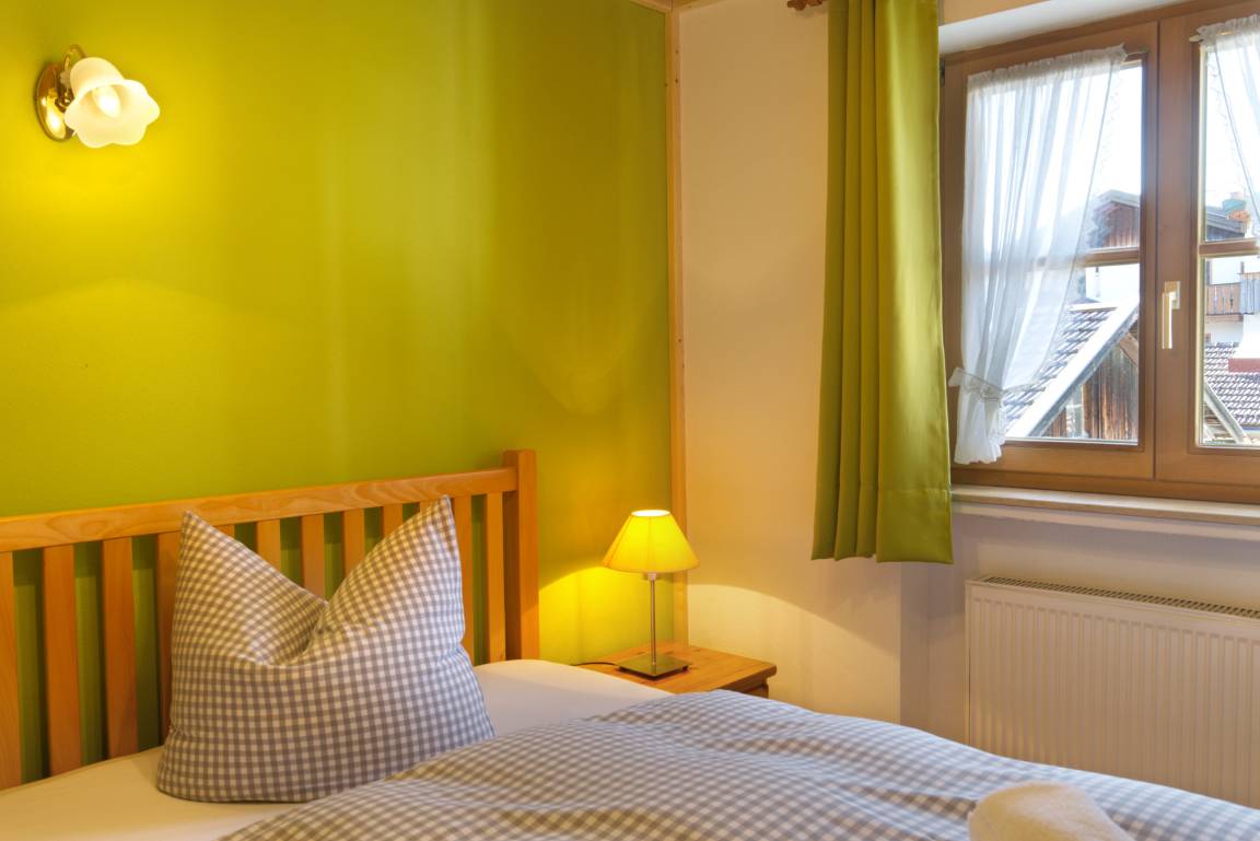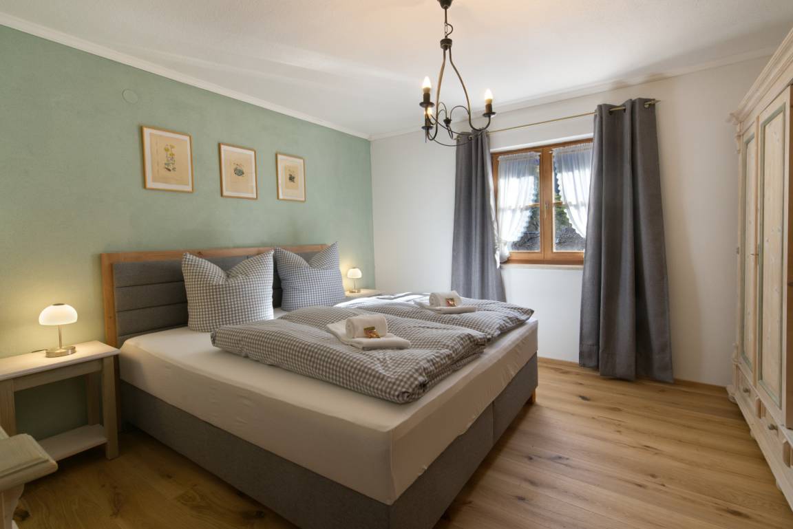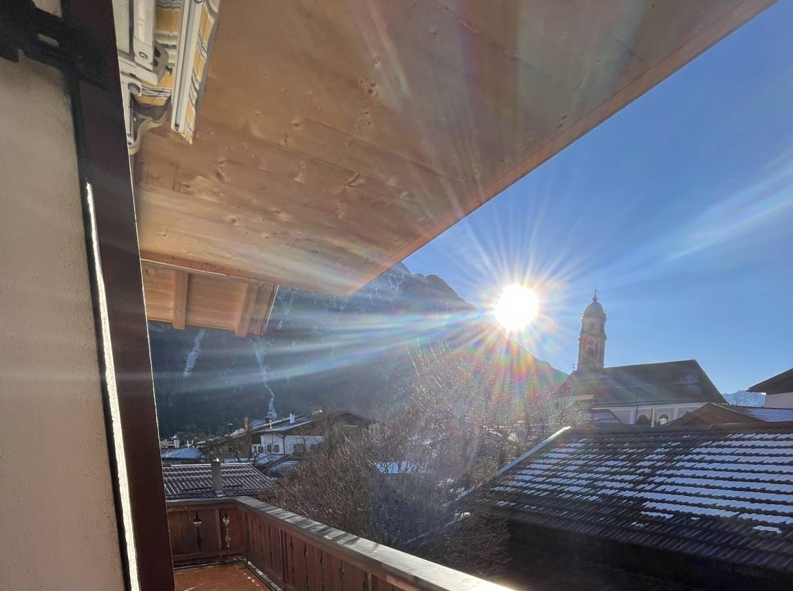 Die Wohnung ist über eine Treppe in das Obergeschoss vom Haupteingang des Hauses erreichbar. Sie verfügt über ein gemütliches Wohnzimmer mit großem Esstisch und einer Eckbankgruppe. Ein großes Sofa lädt zum entspannen ein (Flachbild-TV). Das Highlight ist der umlaufende Süd-/Ostbalkon mit einem tollen Blick zum Karwendelgebirge oder zur Kirche. Das Hauptschlafzimmer mit einem gemütlichen Boxspringbett 180/200cm und Kleiderschrank zweigt vom Flur ab. Das zweite, kleinere Schlafzimmer für eine Einzelperson wird über die Küche erreicht. Das Badezimmer mit DU/WC kann ebenfalls vom Flur aus betreten werden. Für den PKW steht auf dem Hof unweit des Hauseingangs ein eigener Stellplatz zur Verfügung.