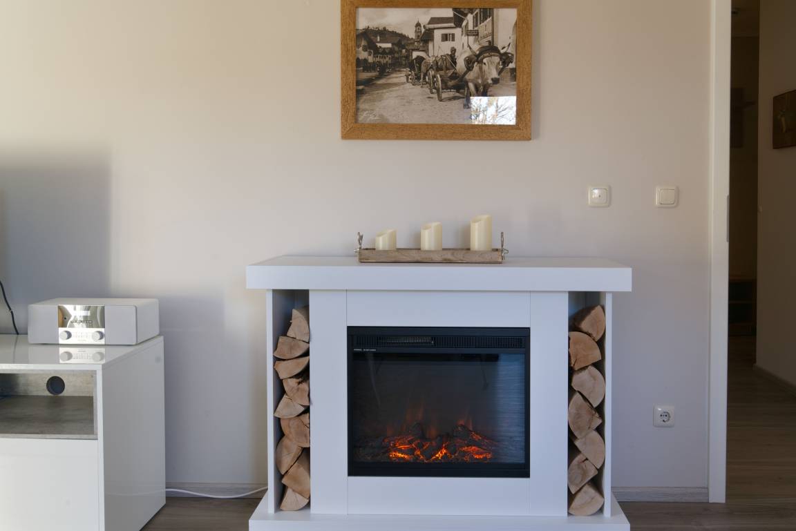 Couchgruppe (ausziehbar) und elektrischer Kamin