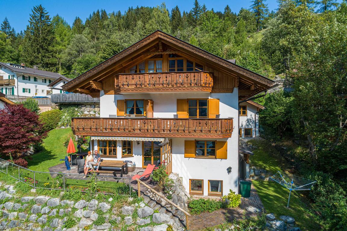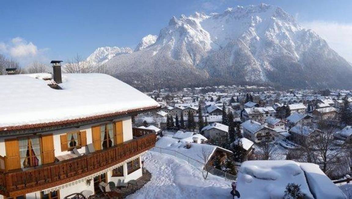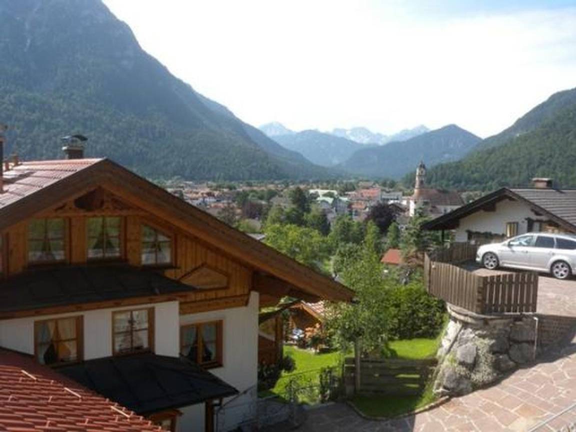 Haus am Kranzberg: Romantisch und ruhig gelegenes Landhaus etwas oberhalb von Mittenwald mit herrlichem Blick über den Ort und Richtung Karwendelgebirge. Die Wanderwege zum Kranzberg beginnen am Haus und im Winter ist das Skigebiet Mittenwald - Kranzberg (Luttensee) schnell erreicht.