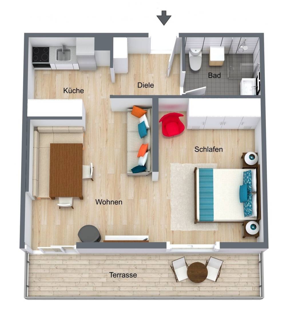 2 Zimmer-Wohnung (48 qm) im Parterre mit Terrasse.