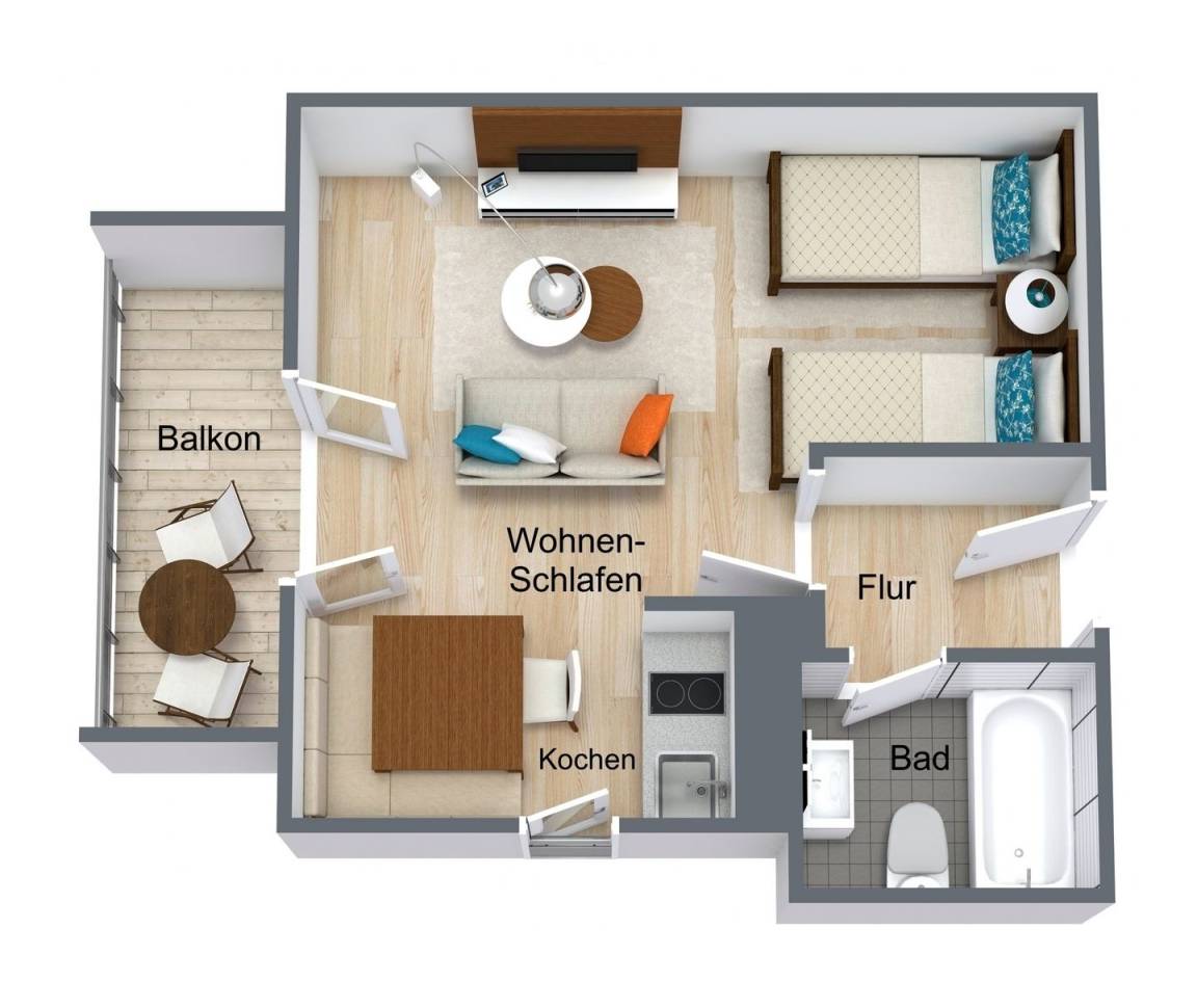 einem Wohnschlafraum mit kleiner Sesselgruppe und einer Schlafnische mit 2 Boxspring-Einzelbetten, die sich natürlich auch zusammenstellen lassen.