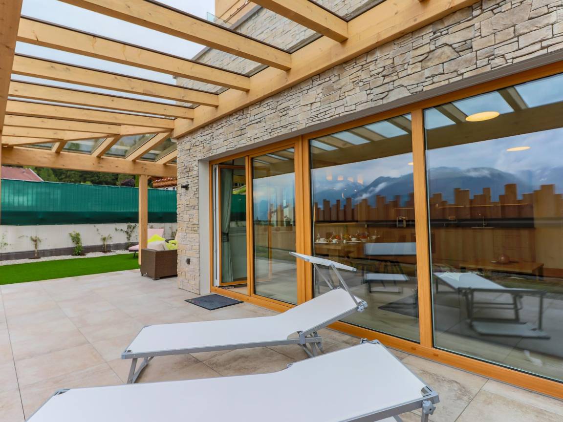 Hausbeschreibung : Genießen Sie einen Aufenthalt in traumhafter Atmosphäre. Die Unterkunft ist im alpinen Chic ausgestattet und bereits vom Frühstückstisch aus können Sie durch die Panoramascheibe den Ausblick auf die Bergwelten des Nationalparks Hohe Tauern und die umliegende Landschaft genießen. Sie residieren auf ca. 100 m² Wohnfläche, verfügen über eine eigene Sauna und haben einen schönen eingezäunten Garten zur Verfügung, wo Kinder und Haustiere sicher umhertollen können