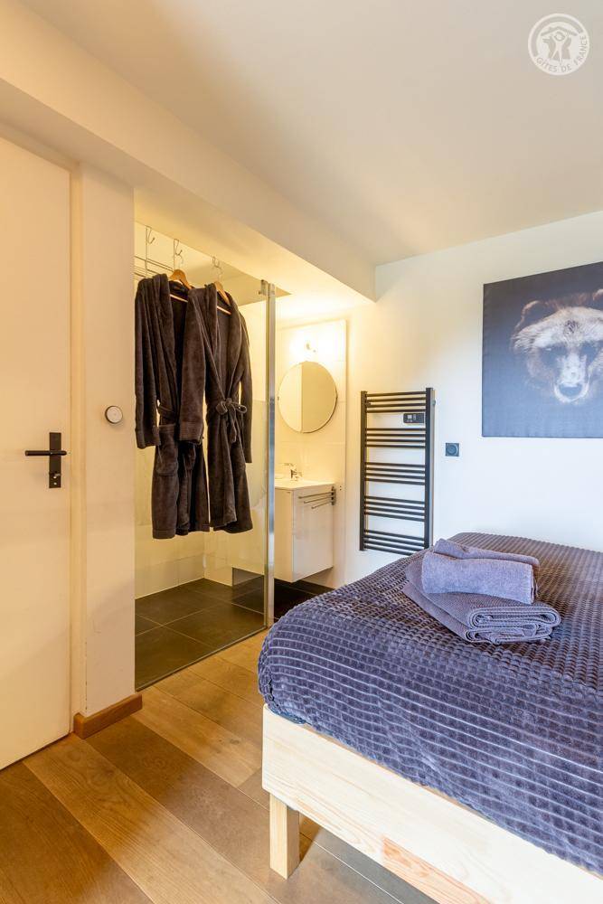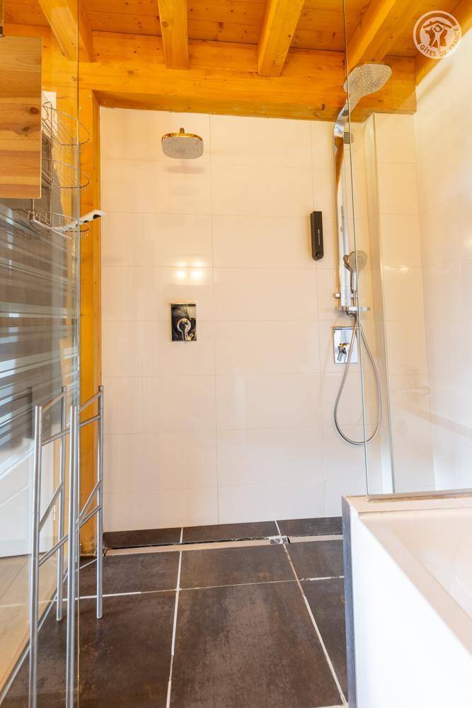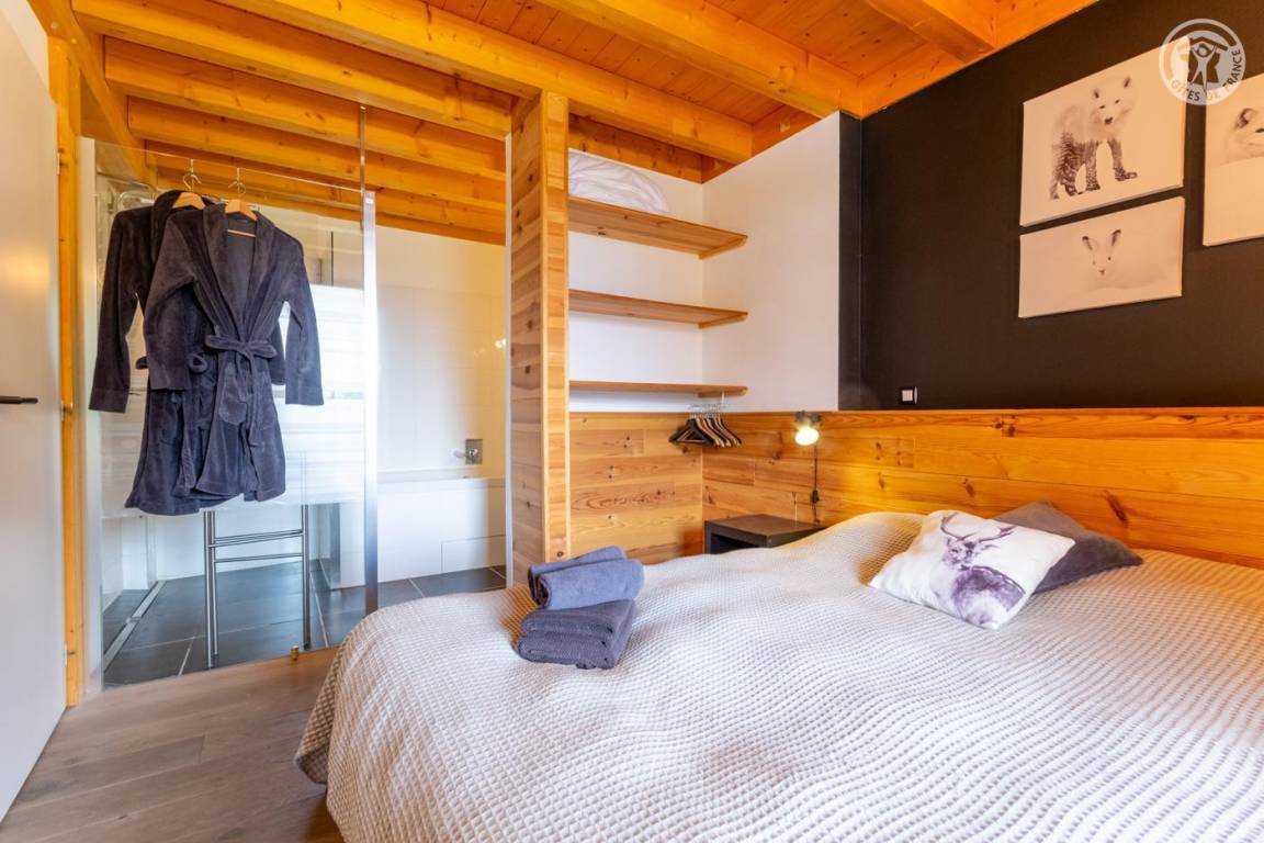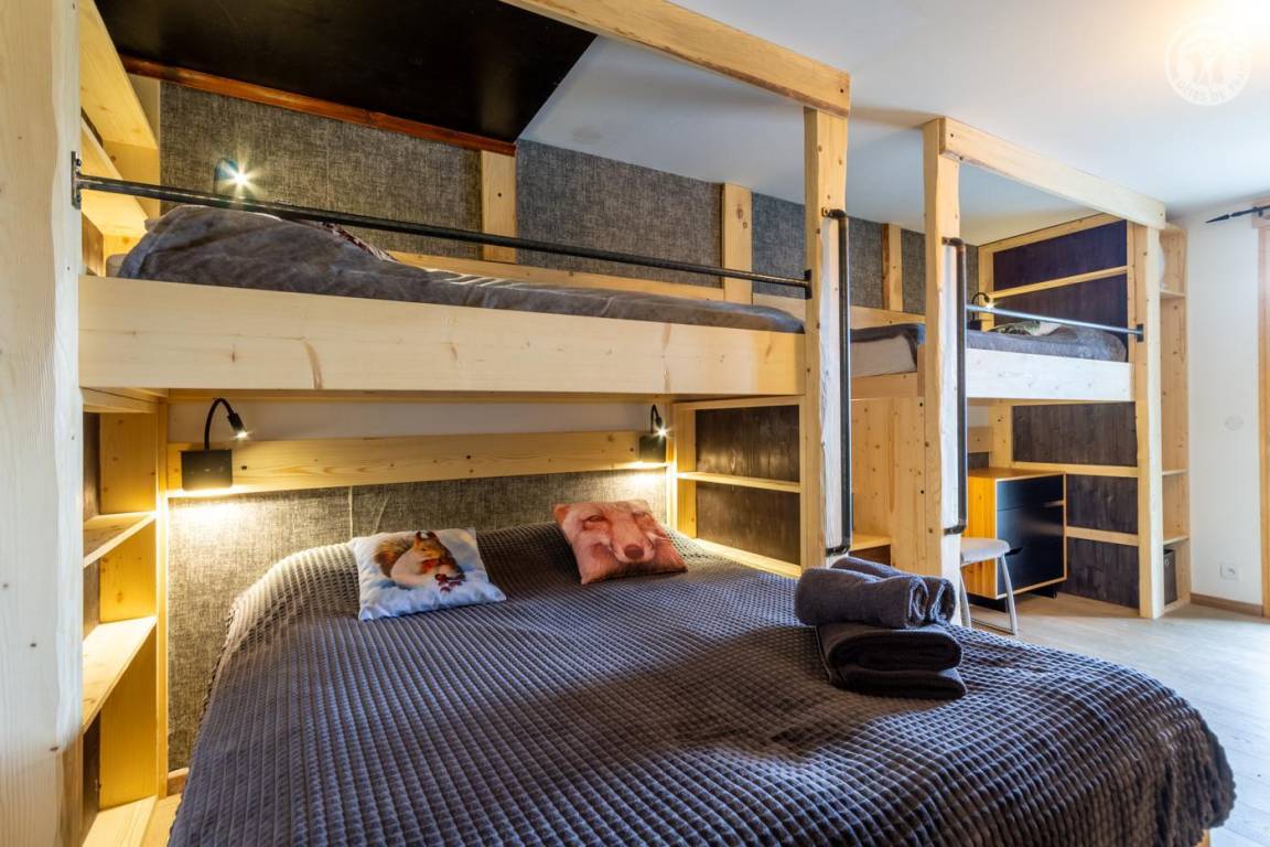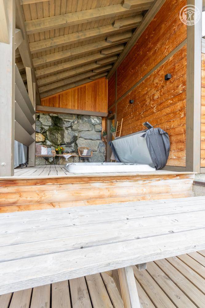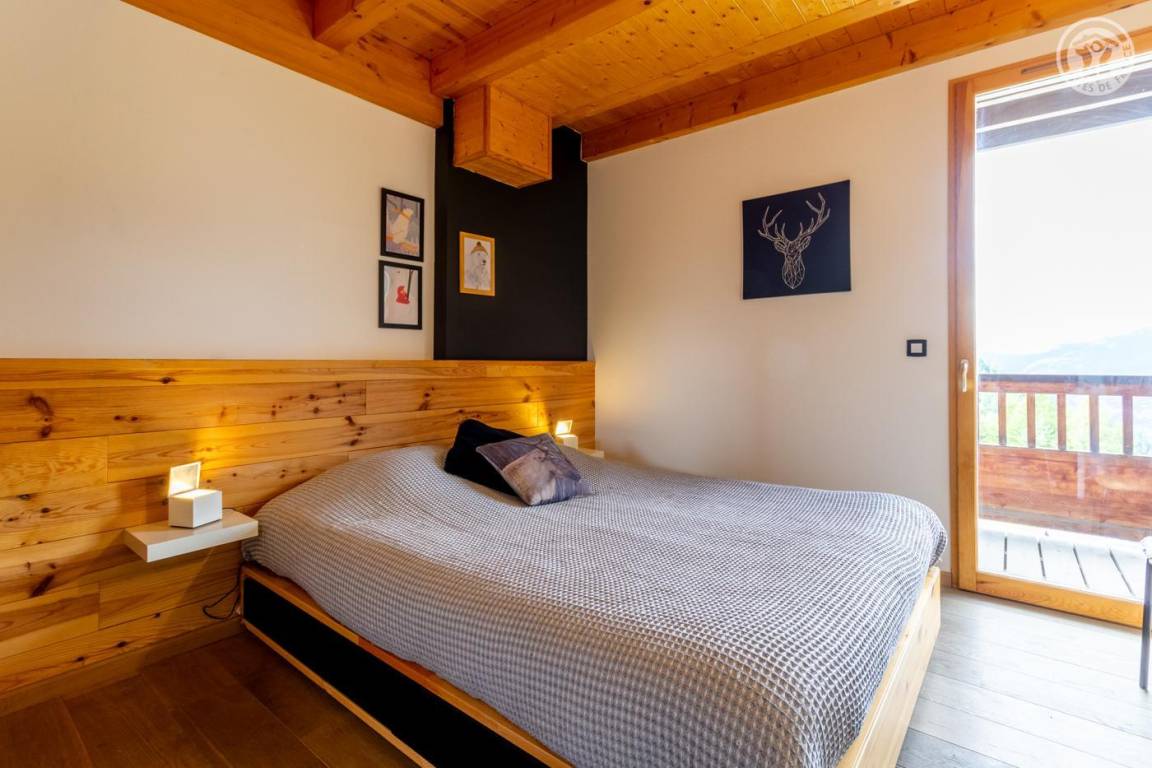 Individuelles Chalet auf 3 Ebenen. Im Erdgeschoss: Eingang mit Schuhtrockner und Skiständer, Waschküche (Waschmaschine und Trockner), 1 Schlafzimmer mit zum Schlafzimmer hin offenem Duschbereich (4 Einzelbetten 80x200 cm, davon 2 Einzelbetten und 2 Etagenbetten), 1 Schlafzimmer mit Duschbereich offen zum Schlafzimmer (1 Doppelbett 160x200 cm), separates WC. Im 1. Stock: 1 Schlafzimmer mit Badezimmer (Badewanne + Doppeldusche) (2 Einzelbetten 90x200 cm, die zusammengestellt werden können), 1 Schlafzimmer mit Waschbeckenbereich (1 Doppelbett 160x200 cm), separates WC, Wellnessbereich mit Sauna 8 Plätze, Dusch- und Ruhebereich, Zugang zum Outdoor-Spa und der Terrasse mit Gartentischen. Im 2. Stock: großes Wohnzimmer mit Wohnküche, Zugang zum Balkon mit entspannenden Gartenmöbeln. 1 privater Parkplatz vor dem Chalet + kostenloser öffentlicher Parkplatz vor dem Chalet.
