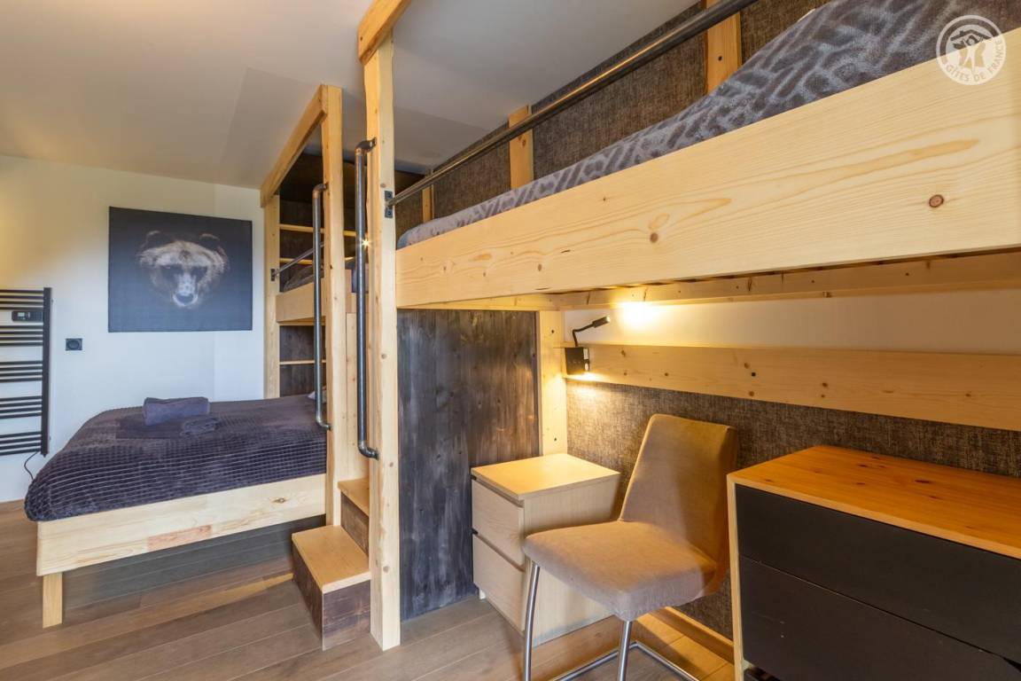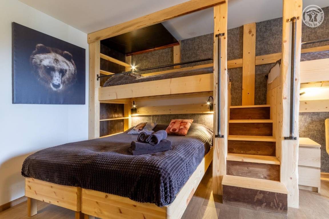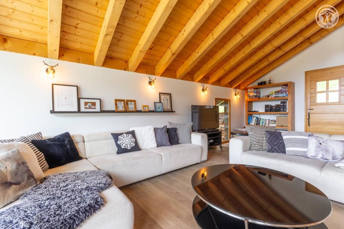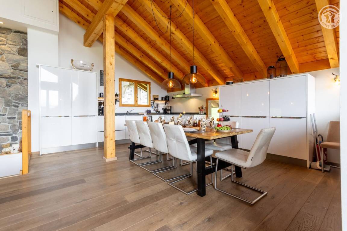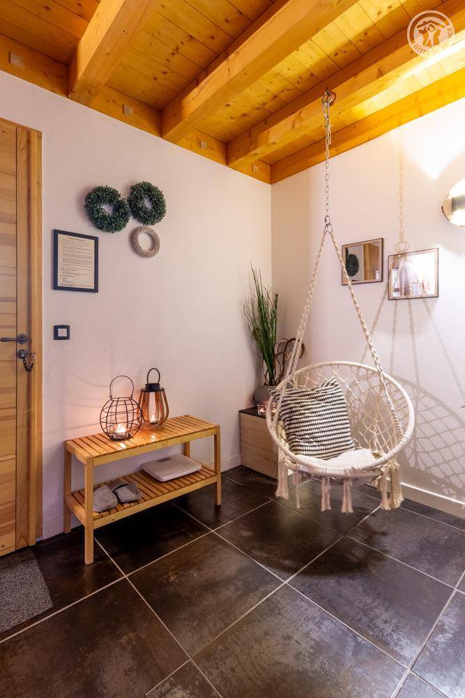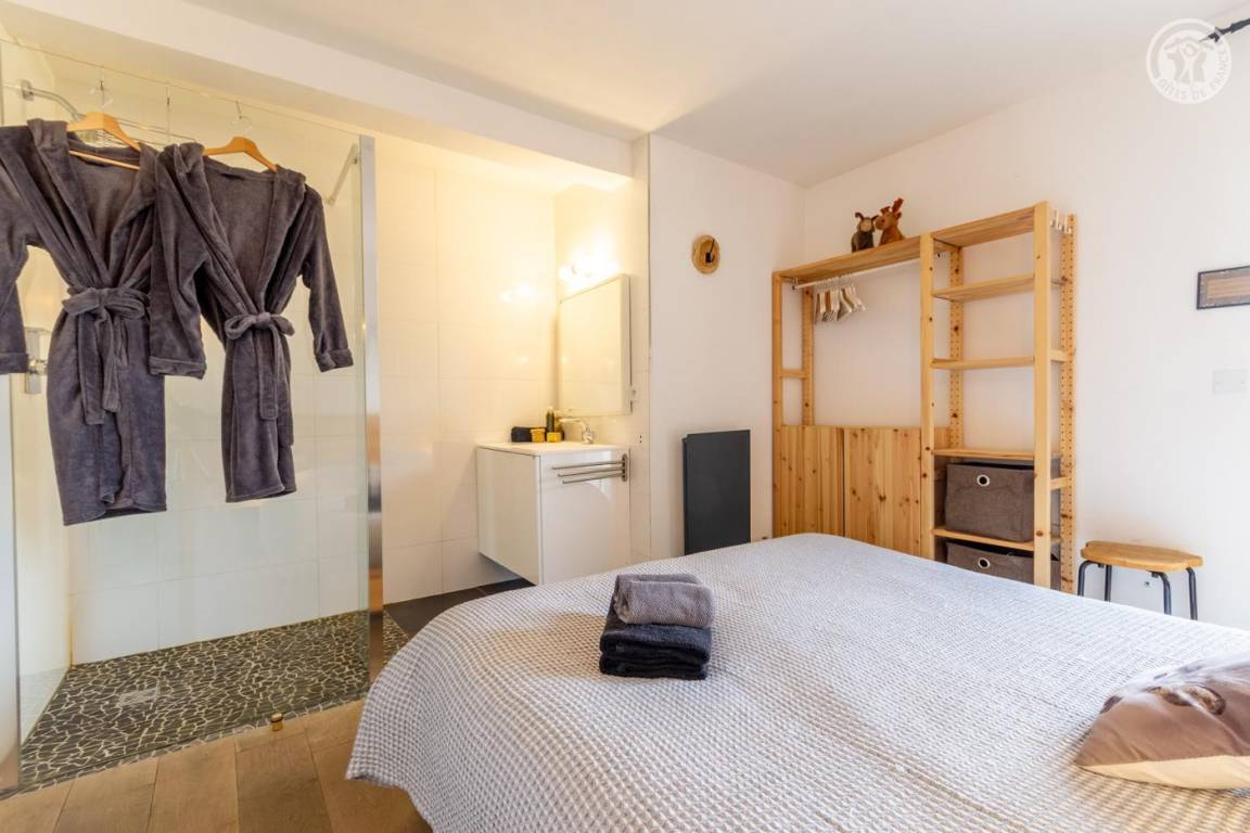 Individuelles Chalet auf 3 Ebenen. Im Erdgeschoss: Eingang mit Schuhtrockner und Skiständer, Waschküche (Waschmaschine und Trockner), 1 Schlafzimmer mit zum Schlafzimmer hin offenem Duschbereich (4 Einzelbetten 80x200 cm, davon 2 Einzelbetten und 2 Etagenbetten), 1 Schlafzimmer mit Duschbereich offen zum Schlafzimmer (1 Doppelbett 160x200 cm), separates WC. Im 1. Stock: 1 Schlafzimmer mit Badezimmer (Badewanne + Doppeldusche) (2 Einzelbetten 90x200 cm, die zusammengestellt werden können), 1 Schlafzimmer mit Waschbeckenbereich (1 Doppelbett 160x200 cm), separates WC, Wellnessbereich mit Sauna 8 Plätze, Dusch- und Ruhebereich, Zugang zum Outdoor-Spa und der Terrasse mit Gartentischen. Im 2. Stock: großes Wohnzimmer mit Wohnküche, Zugang zum Balkon mit entspannenden Gartenmöbeln. 1 privater Parkplatz vor dem Chalet + kostenloser öffentlicher Parkplatz vor dem Chalet.
