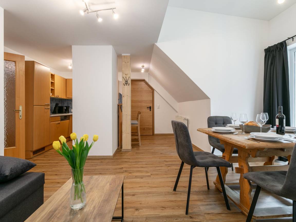 Hausbeschreibung : Zwischen den Skigebieten Lachtal und Hohentauern gelegen, lädt diese komplett renovierte Wohnung auch außerhalb der Wintersaison zum Wandern, Radfahren oder einfach nur zum Entspannen in der schönen Natur ein. Das gemütliche Wohnzimmer und die voll ausgestattete Küche lassen keine Wünsche offen. Zur Wohnung gehört auch eine schöne überdachte Terrasse. Frühstücken können Sie im ADEG, das nur wenige Gehminuten von dieser Wohnung entfernt ist.