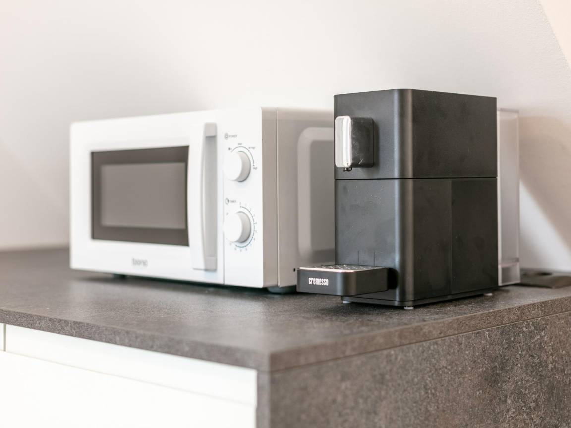 In der 3. Etage: Wohnzimmer mit Doppelschlafcouch, Esstisch , offene Küche mit Kochplatte, Dunstabzugshaube, Kaffeemaschine, Backofen, Geschirrspüler, Kühl-/Gefrierkombination , 4x Schlafzimmer mit Doppelbett , Badezimmer mit Dusche, Waschbecken, Toilette
