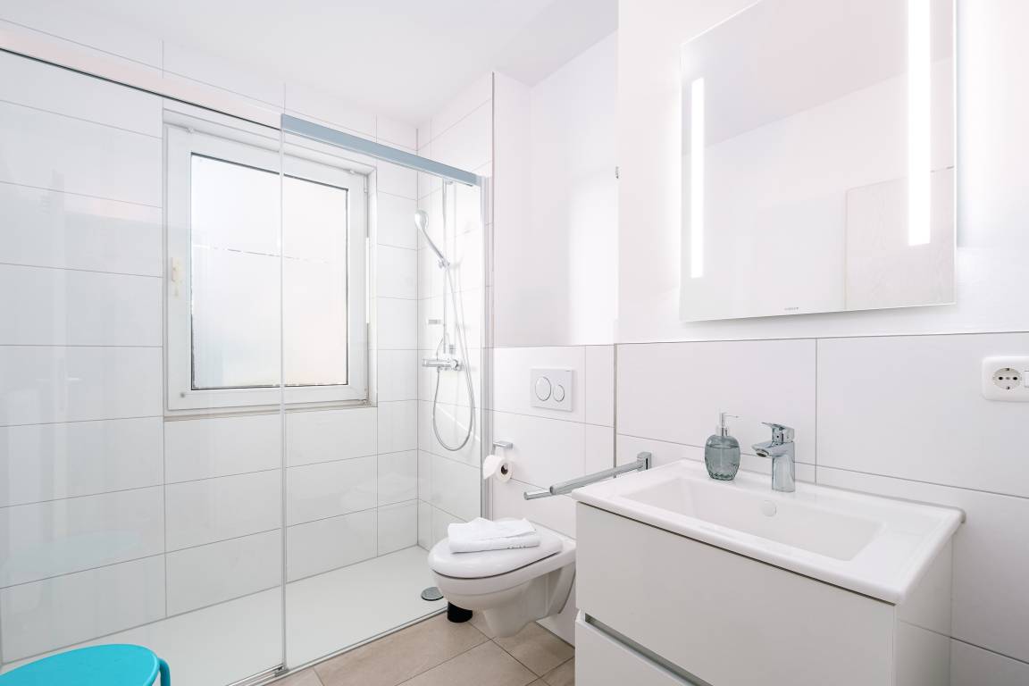 Das renovierte Badezimmer ist mit einer Dusche (flacher Einstieg), einem WC und einem Waschbecken mit Spiegel ausgestattet.