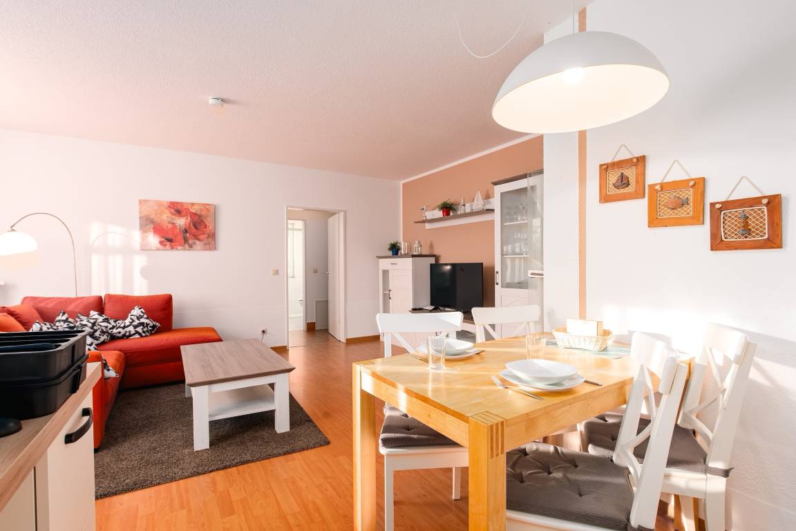 In dem stilvoll eingerichteten Wohnbereich der Ferienwohnung Sanddorn erwartet Sie neben einer bequemen Couchgarnitur (Aufbettung für 2 Personen möglich) auch ein Flachbild-TV und die offene Küchenzeile. Ein kleiner Essbereich für 4 Personen schießt sich dort an.