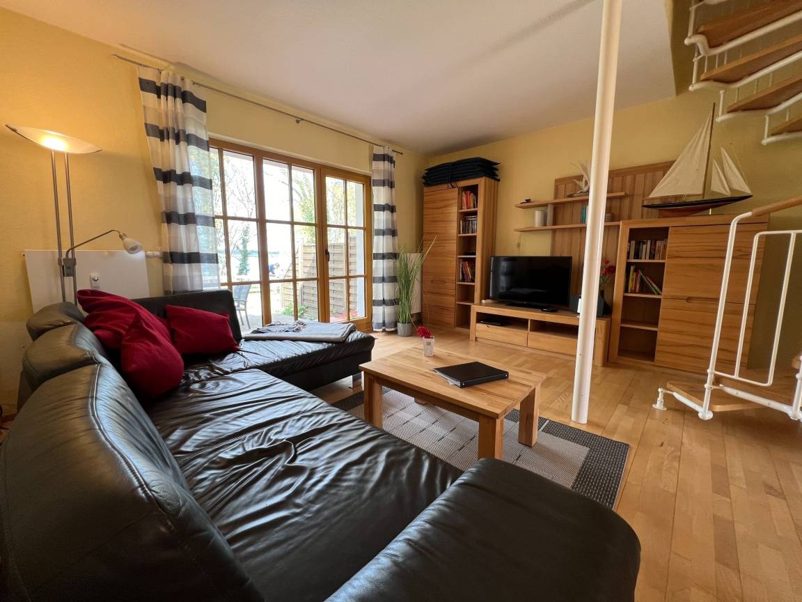 Die großzügige Maisonette-Ferienwohnung bietet Platz für bis zu 6 Personen und liegt direkt am Strand. Die Schlafzimmer sind über eine schmale Wendeltreppe erreichbar, was der Wohnung einen besonderen, gemütlichen Charakter verleiht. Sie verfügt über eine sonnige Veranda mit Meerblick, eine private Terrasse für entspannte Stunden im Freien sowie kostenfreies WLAN und einen eigenen Parkplatz.