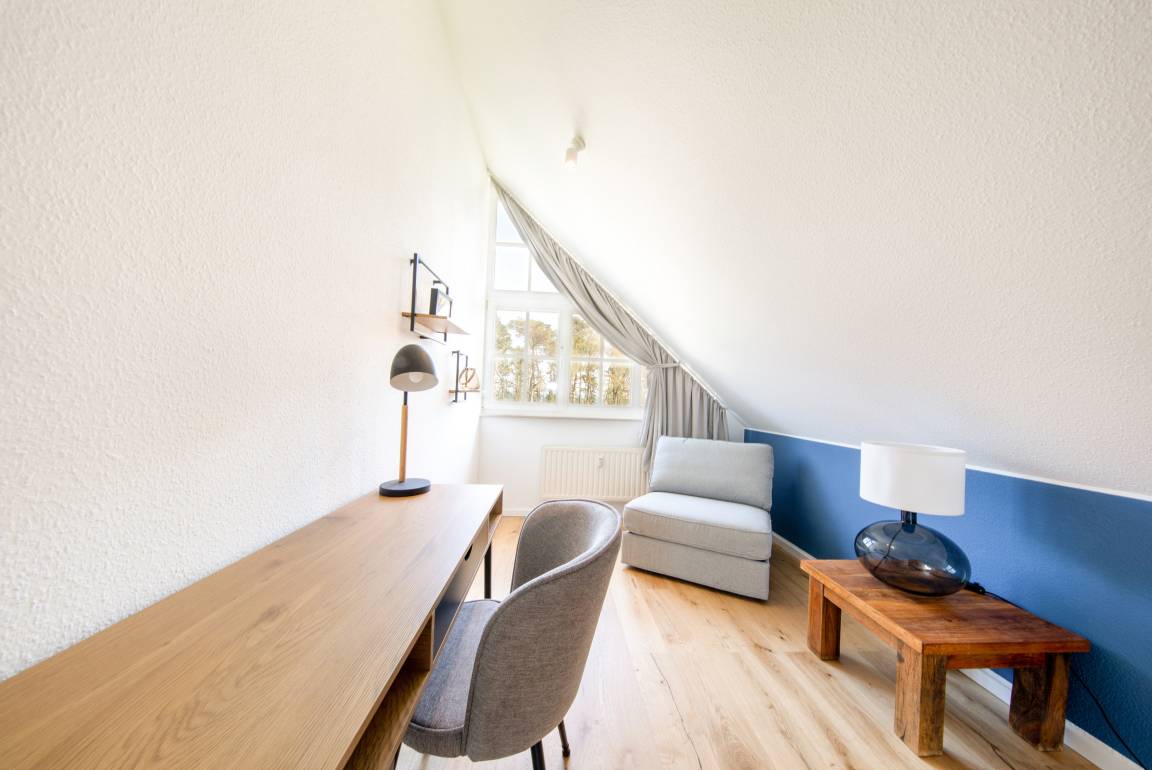 Seit Mitte 2024 steht Ihnen diese frisch renovierte Ferienwohnung Nr. 09 im Haus an der Düne Mönchgut/Gager zur Verfügung. In einem wunderschönen mit Reet gedeckten Haus befindet sich dieses gemütliche Domizil nur 50m vom feinsandigen Ostseestrand entfernt. Die Lage der Immobilie lädt Naturliebhaber, sowie Radfahrer besonders ein. Die mondänen Ostseebäder Sellin, Baabe und Göhren sind sowohl mit dem Rad als auch mit dem Auto in wenigen Minuten zu erreichen. Die Ferienwohnung befindet sich im 1.OG des Hauses und verfügt über 2 kostenfreie Parkplätze. Auf 2 Etagen stehen Ihnen rund 90m² Wohnfläche zur Verfügung. Der offen gestaltete Wohn-, Essbereich besticht nicht nur durch modernes Mobiliar und eine voll ausgestattete Küchenzeile, sondern verfügt zusätzlich auch über Zugang zu einem in Südausrichtung gelegenen Balkon. Neben dem Wohn-, Essbereich befindet sich in der ersten Etage der Wohnung sowohl ein gemütliches Schlafzimmer, als auch ein modernes Bad mit Dusche und Waschmaschine. Über eine Treppe gelangen Sie in die 2. Etage der Wohnung, in welcher sich ein ebenso offen gestalteter Wohn-, Schlafbereich befindet. Neben dem gemütlichen Wohnzimmer mit großem Sofa, ist hier auch ein großes Doppelbett, sowie eine Aufbettung in Form eines modernen Schlafsessel zu finden. Die Ferienwohnung verfügt selbstverständlich auch über alle gängigen und modernen Annehmlichkeiten wie W-Lan, Geschirrspüler und weiteren modernen Küchengeräten.