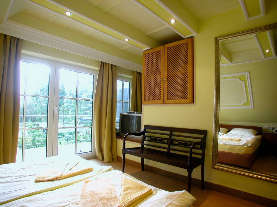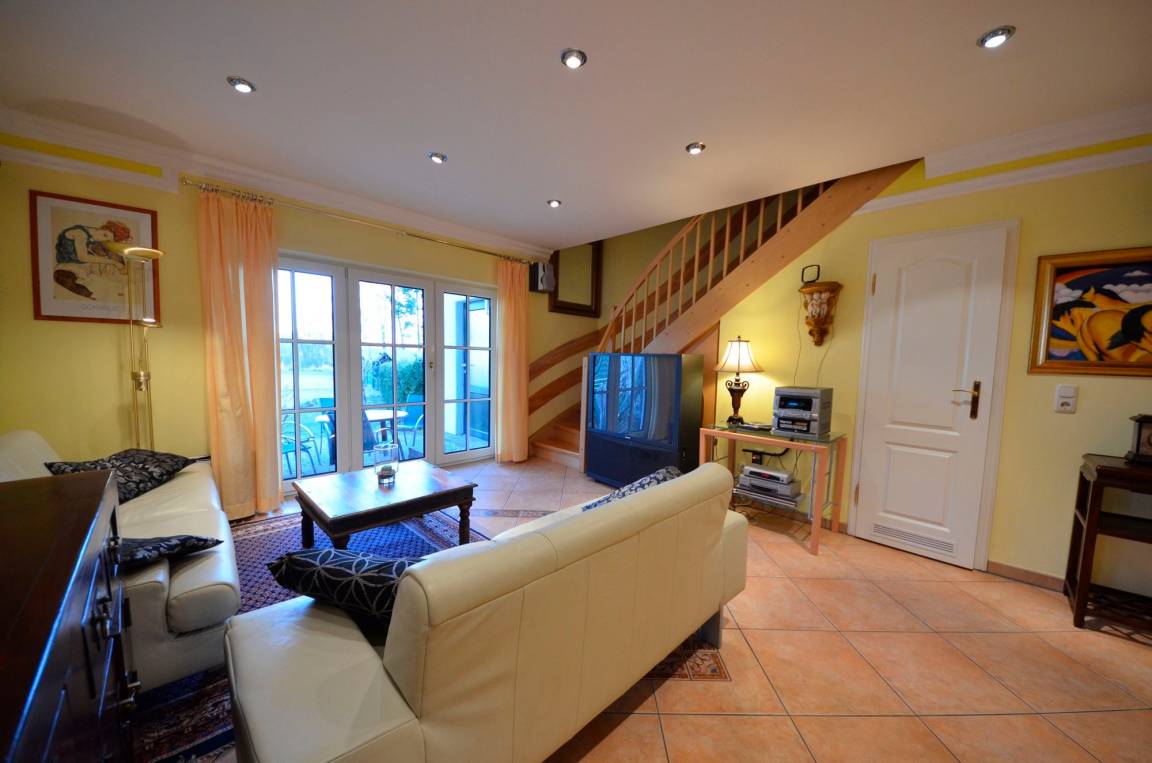 Eingangsflur mit Garderobe und Schuhschrank, Fußbodenheizung, großzügiges Wohn- Esszimmer, schöne Couchgarnitur mit Opiumtisch, Esstisch mit 5 Stühlen, Geschirrschrank, Satt - TV mit 82-106 cm! Großbild mit ca.40 Programmen, Stereoanlage, CD - Player, Telefontisch mit Telefon und balinesischem Spiegel pp.