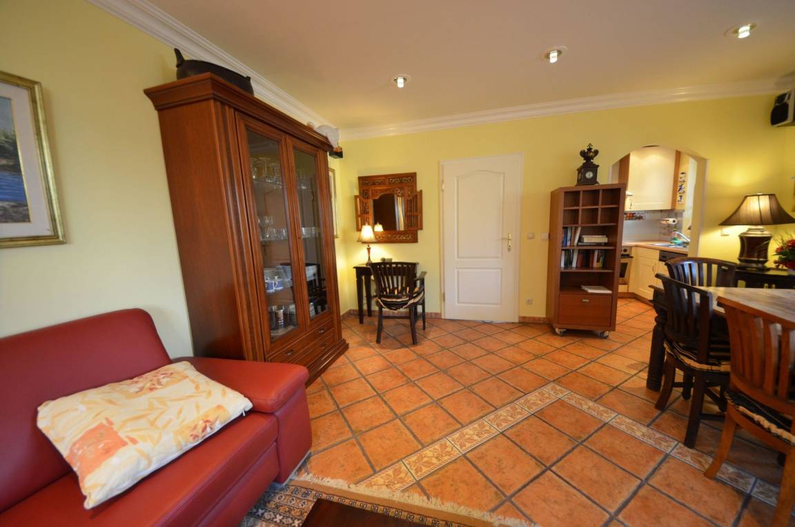 Stereo / CD, Speisetafel mit 6 Stühlen, Geschirrschrank, balinesischem Spiegel, Kinderhochstuhl, Wände dekoriert mit Bildern, dekorative Beleuchtung.