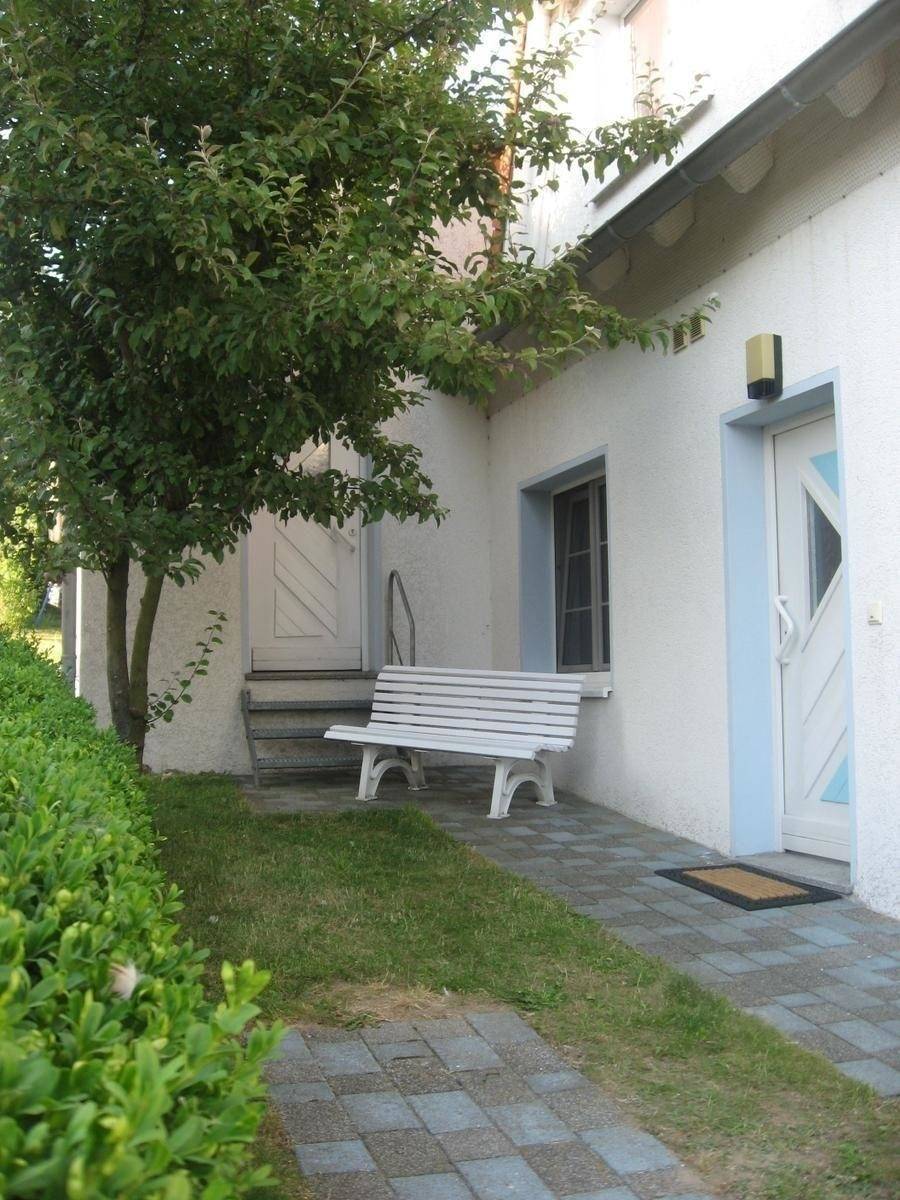Unsere Ferienwohnung befindet sich im Erdgeschoss. Vor der Wohnung befindet sich ein Tisch und Sitzgelegenheiten.
