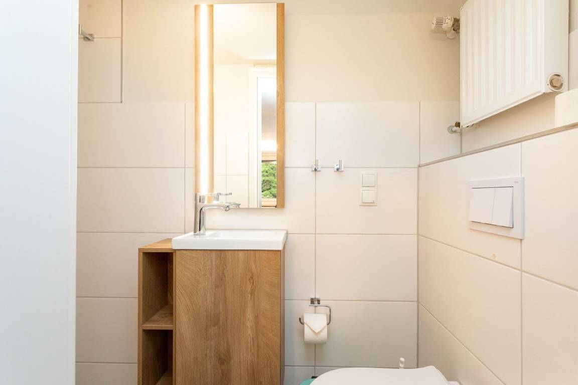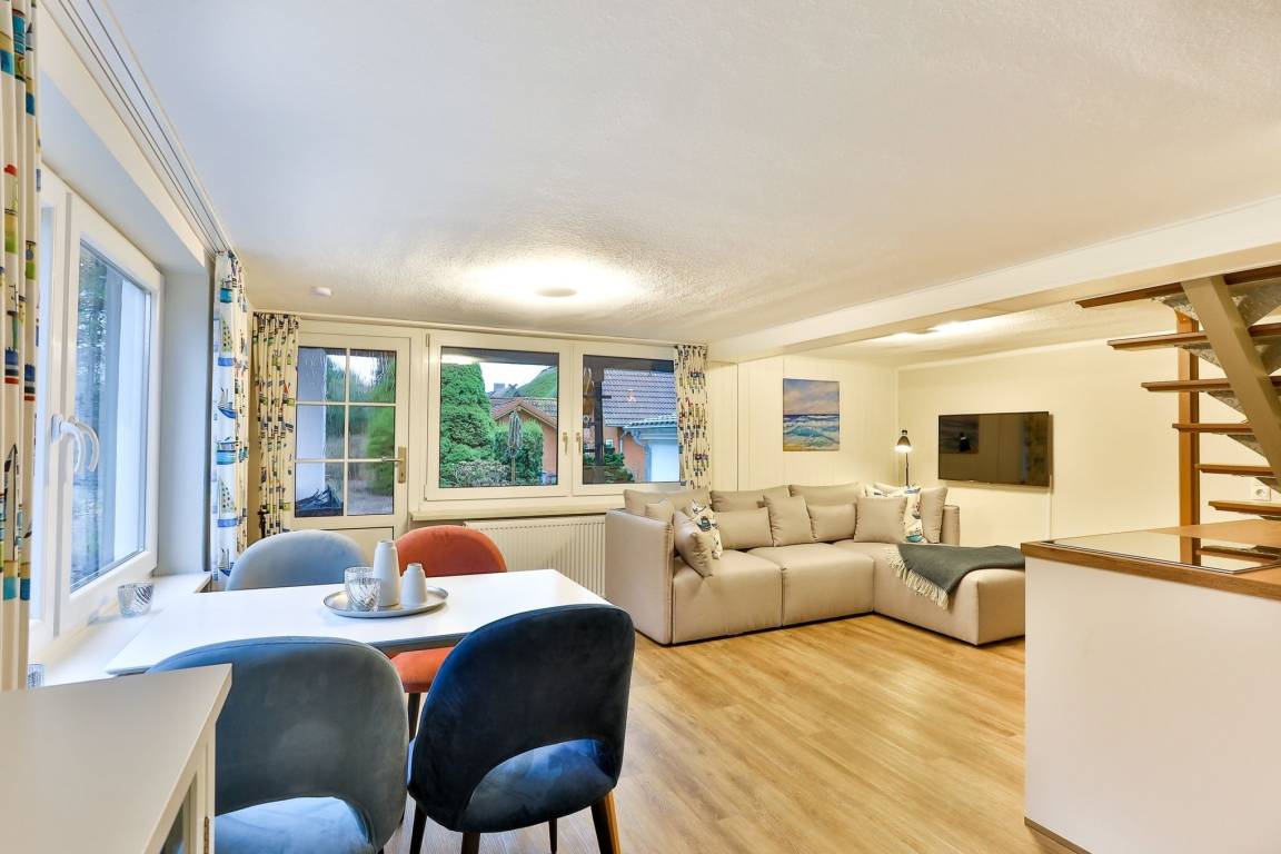 Im Erdgeschoss unseres "Raumwunders Rotbuche" befindet sich ein gemütlicher Wohn- und Essbereich mit einer kleinen Küchenzeile und einem Badezimmer mit WC und Dusche. Im Obergeschoss ist das Reethus mit zwei Schlafzimmern und einem kleinen WC ausgestattet. Vor dem Hauseingang befindet sich eine kleine, überdachte Terrasse. Bitte beachten sie, dass das Reethus eine eingeschränkte Deckenhöhe von 2 m hat.