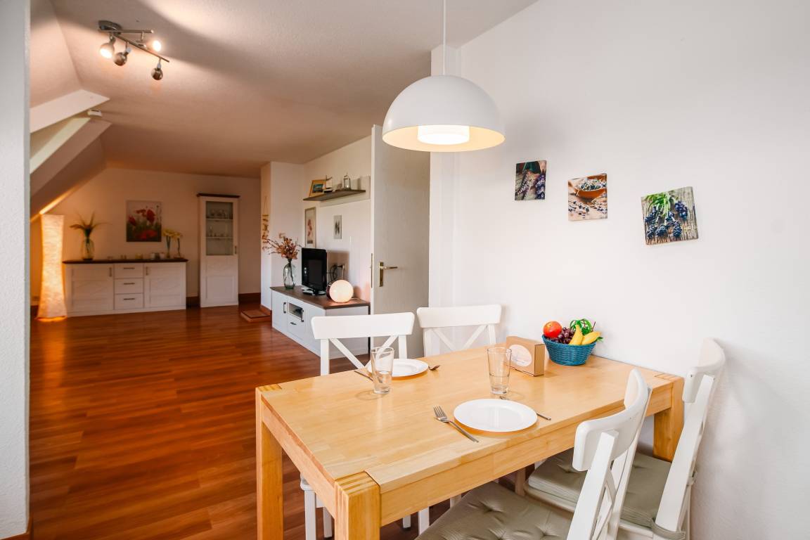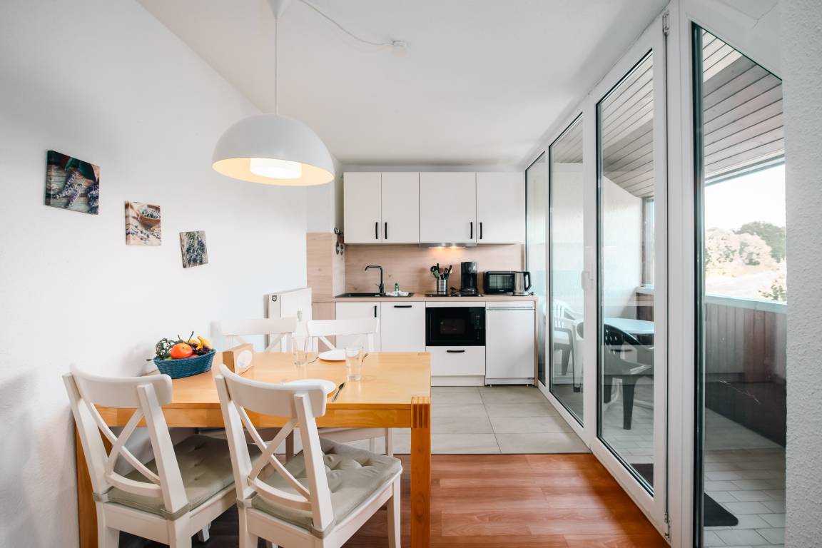 Die sich anschließende, erneuerte und offene Küchenzeile bietet Ihnen einen Kühlschrank, einen 4-Platten-Herd, einen Geschirrspüler sowie eine Mikrowelle mit Grill- und Heißluftfunktion. Auch diverse Küchenkleingeräte (Wasserkocher, Kaffeemaschine...) sind vorhanden. Ein kleiner Essbereich für 4 Personen rundet das Gesamterlebnis gekonnt ab.