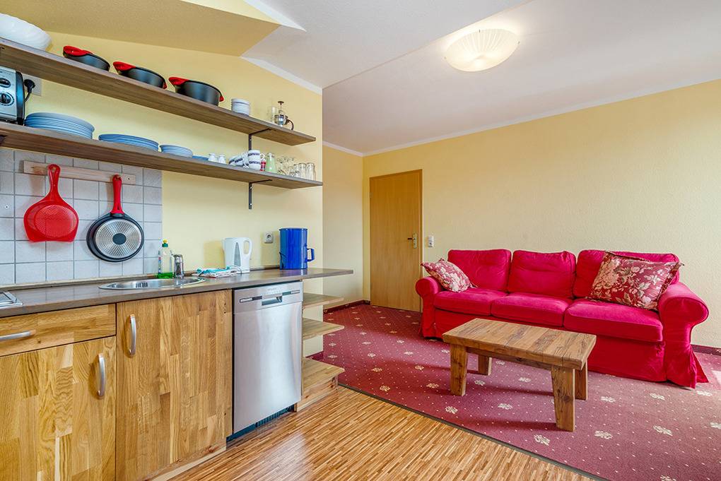 D 98.26 Wohnung 2-4 Pers.: 2-Zimmer-Wohnung mit 37 qm Wohnfläche, 1. Etage. Wohn-/Essraum mit Couchgarnitur (Ausziehcouch 2 Pers.), Esstisch, Küchenzeile (2 P. E-Herd, Spülmaschine). Doppelzimmer. Bad/WC. Balkon mit Sitzmöbeln.