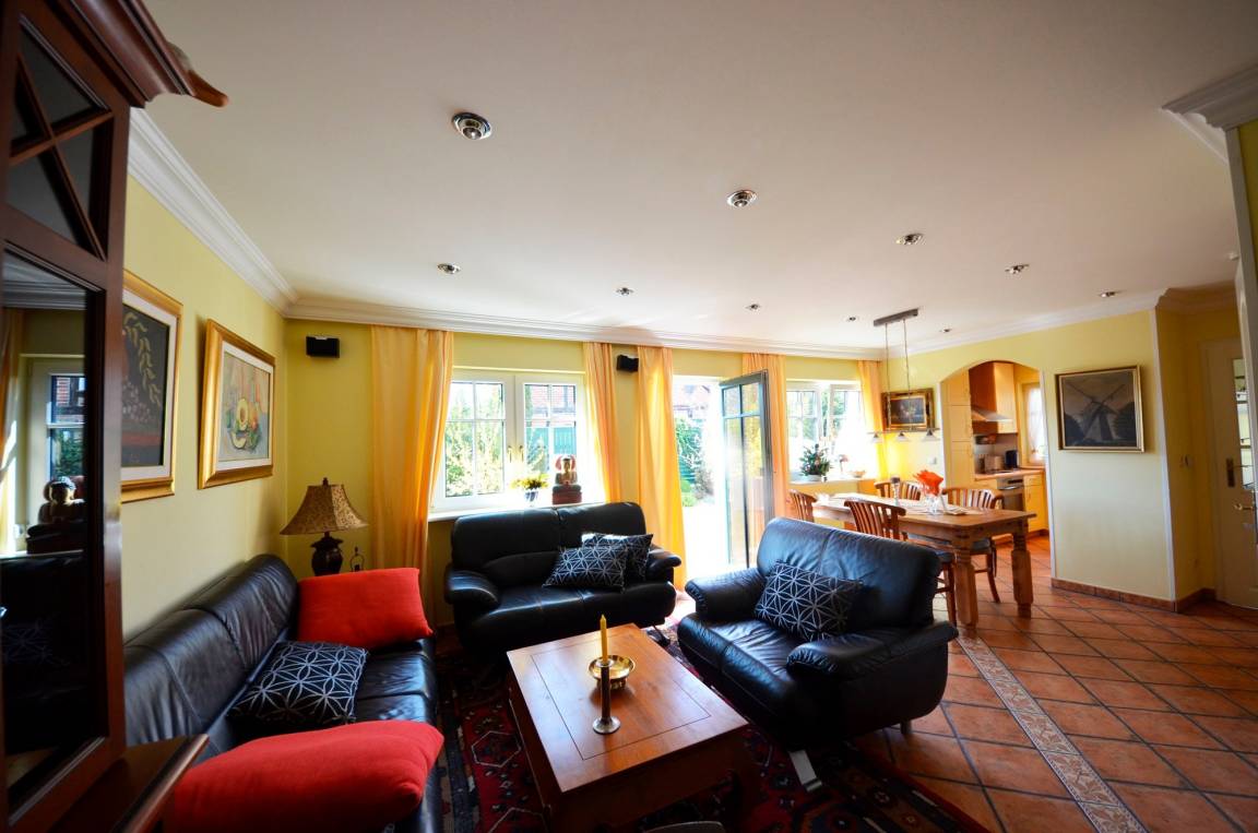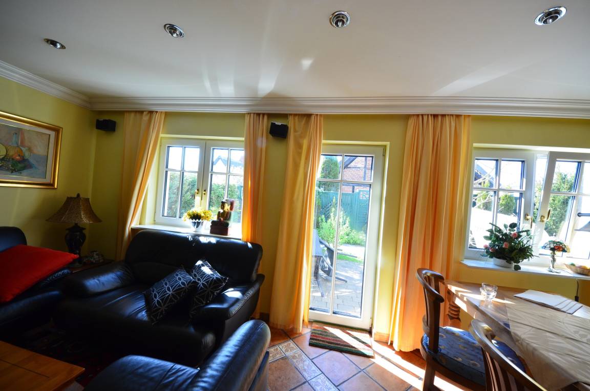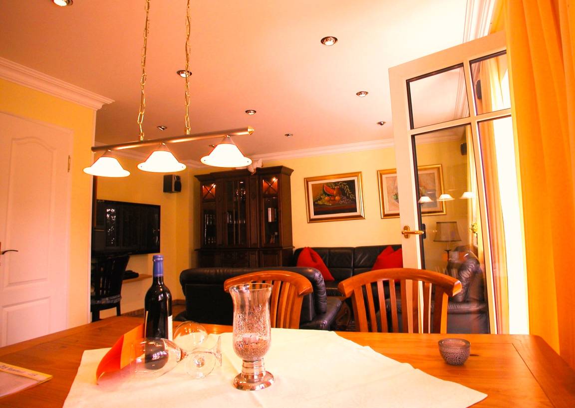 Gemütliches Wohn- Esszimmer mit Ausgang zur mit Pflanzen eingewachsenen Terrasse und Garten, Fußbodenheizung, Esstisch für 4 Personen, schöne Leder-Couch-Garnitur und Opiumtisch, 125cm-Flachbild - TV, Stereo/CD, Geschirrschrank, Telefontisch mit Telefon und balinesischem Spiegel, Kinderhochstuhl, Wände dekoriert mit Bildern.