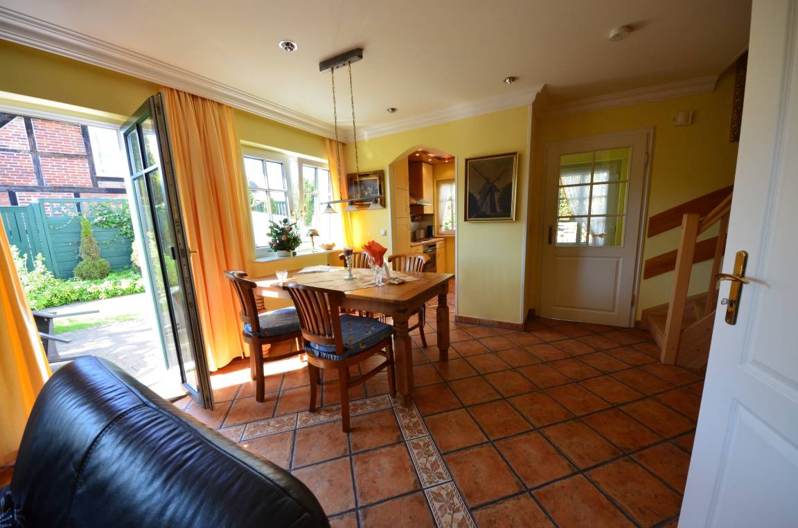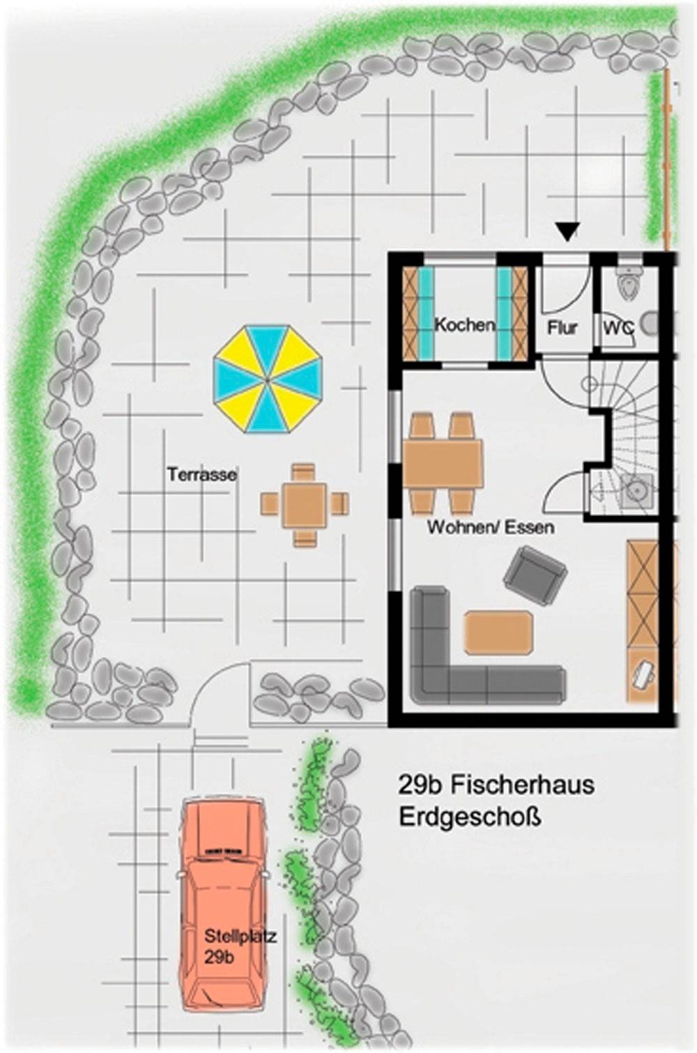 Das Haus verfügt über einen kleinen schön eingewachsenen Gartenteil mit Kirschbaum, Terrasse und Gartenmöbel sowie Doppelstrandkorb.