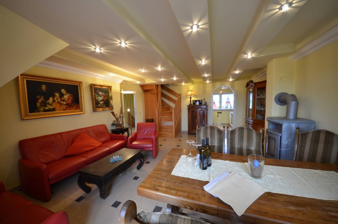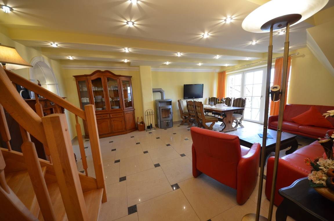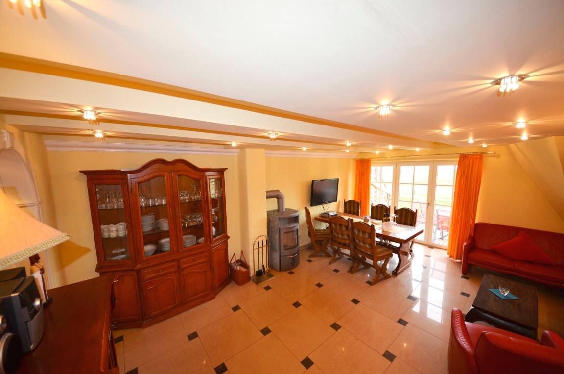 Großzügiges Wohn-Esszimmer mit Ausgang zum großen Balkon mit direktem traumhaften Blick auf die Ostsee, den kleinen Hafen von Groß Zicker und die gegenüber der Bucht liegenden Orte Thiessow und Klein Zicker. Schöne Ledergarnitur mit Opiumtisch. Speisetafel mit 6 Stühlen, großer Hark-Kaminofen, antike Vitrinen, kleine Bücherauswahl, Plasma-TV mit 125 cm Großbild, Fußbodenheizung, DVD-Recorder, Stereoanlage, CD-Player, Kinderhochstuhl, Wände dekoriert mit Spiegeln und Gemälden, sehr ansprechende Beleuchtung