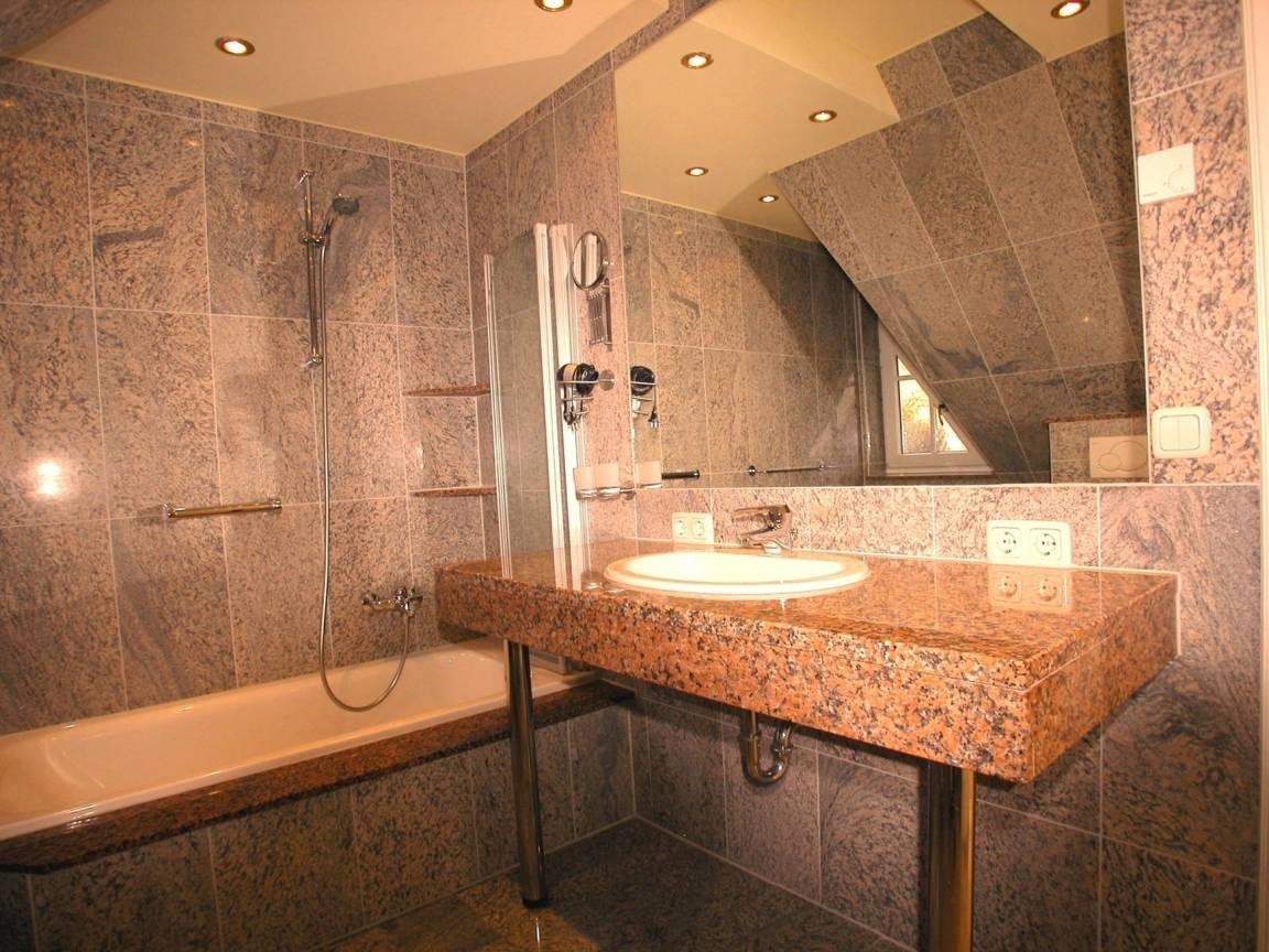1x Badewanne mit Glas-Duschabtrennung, Toilette und Bidet, 1x Duschbad, Granitverkleidung, Fußbodenheizung, Granit-Abdeckungen, große Spiegel, schöne Sanitärausstattung, Einbau-Waschbecken, beheizbarer Handtuchhalter, Fön, Schminkspiegel, dekorative Beleuchtung