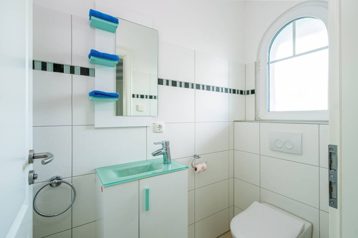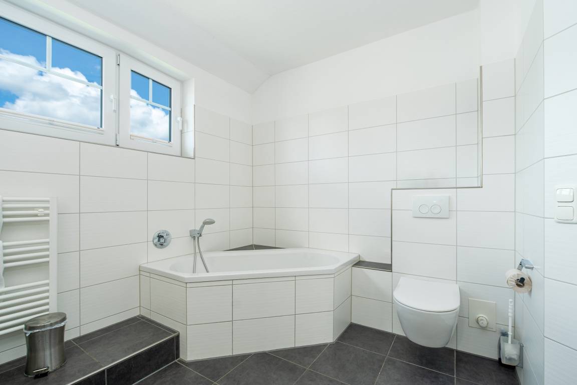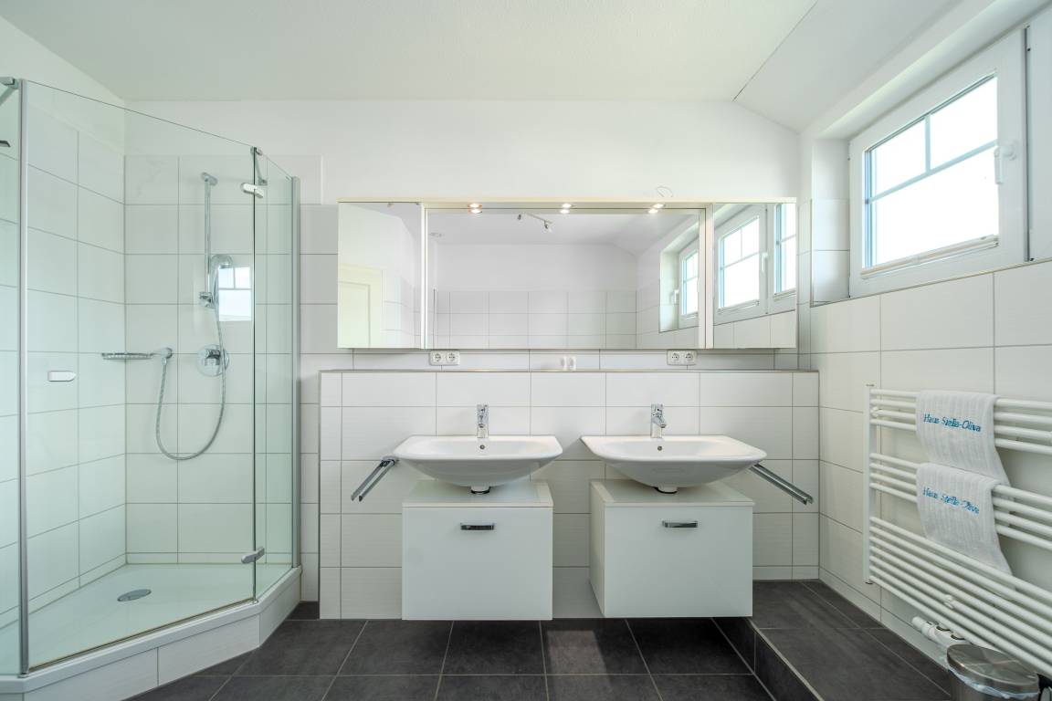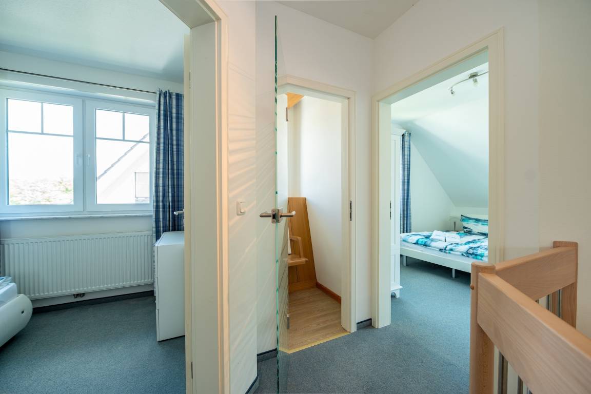 Über die Wendeltreppe erreichen Sie das Obergeschoss mit drei Schlafzimmern: zwei davon mit Doppelbetten (180x200), Fernseher und Kleiderschrank, das dritte mit einem 140x200-Bett. Das helle Badezimmer überzeugt mit anthrazitfarbenen Fliesen, Fußbodenheizung, zwei Waschbecken, Dusche und Badewanne – ideal für entspannte Wellnessmomente.