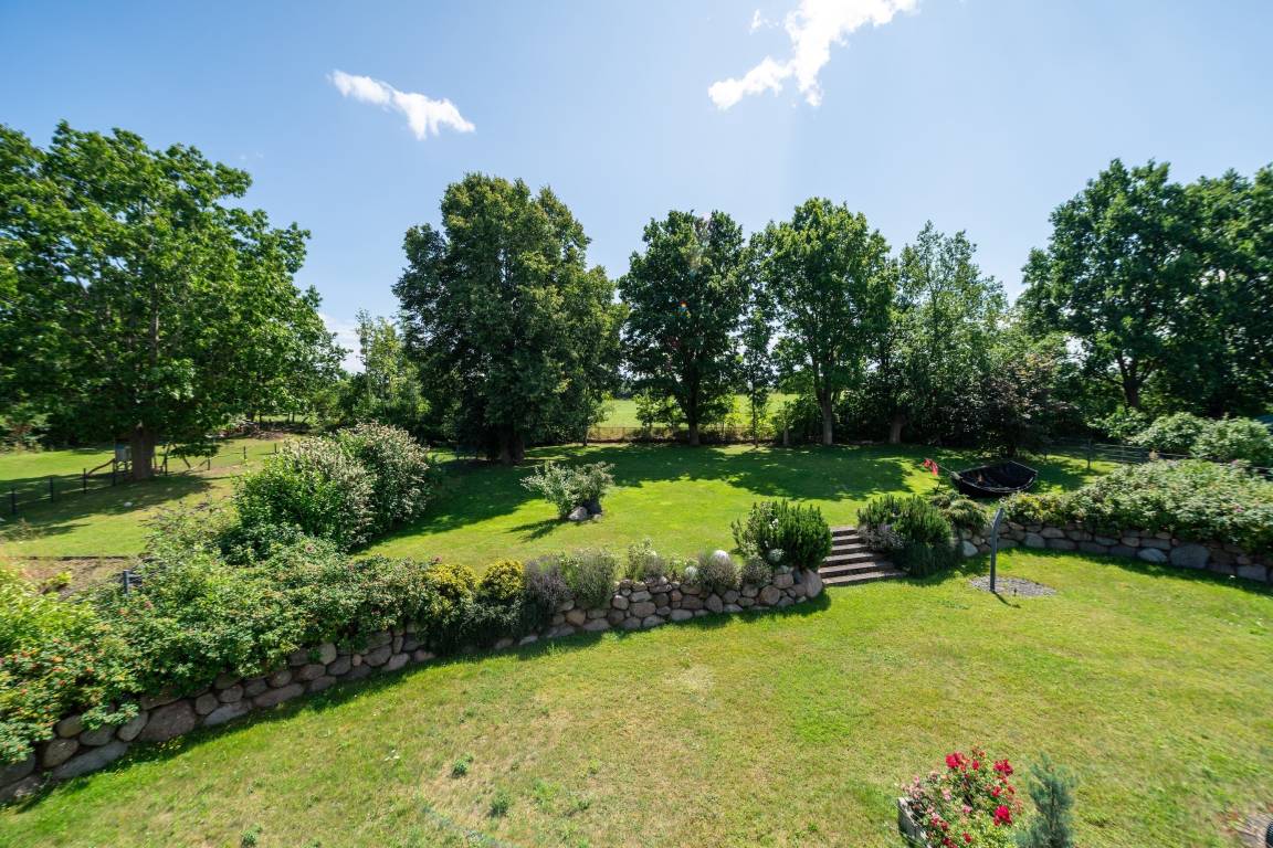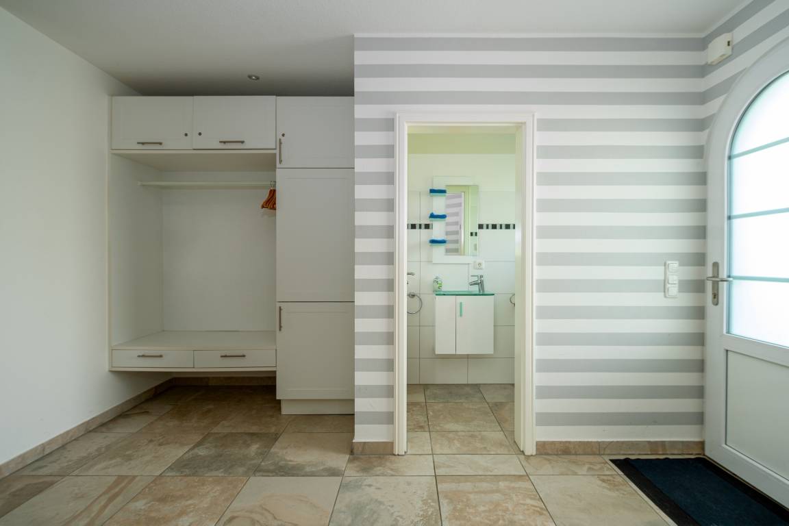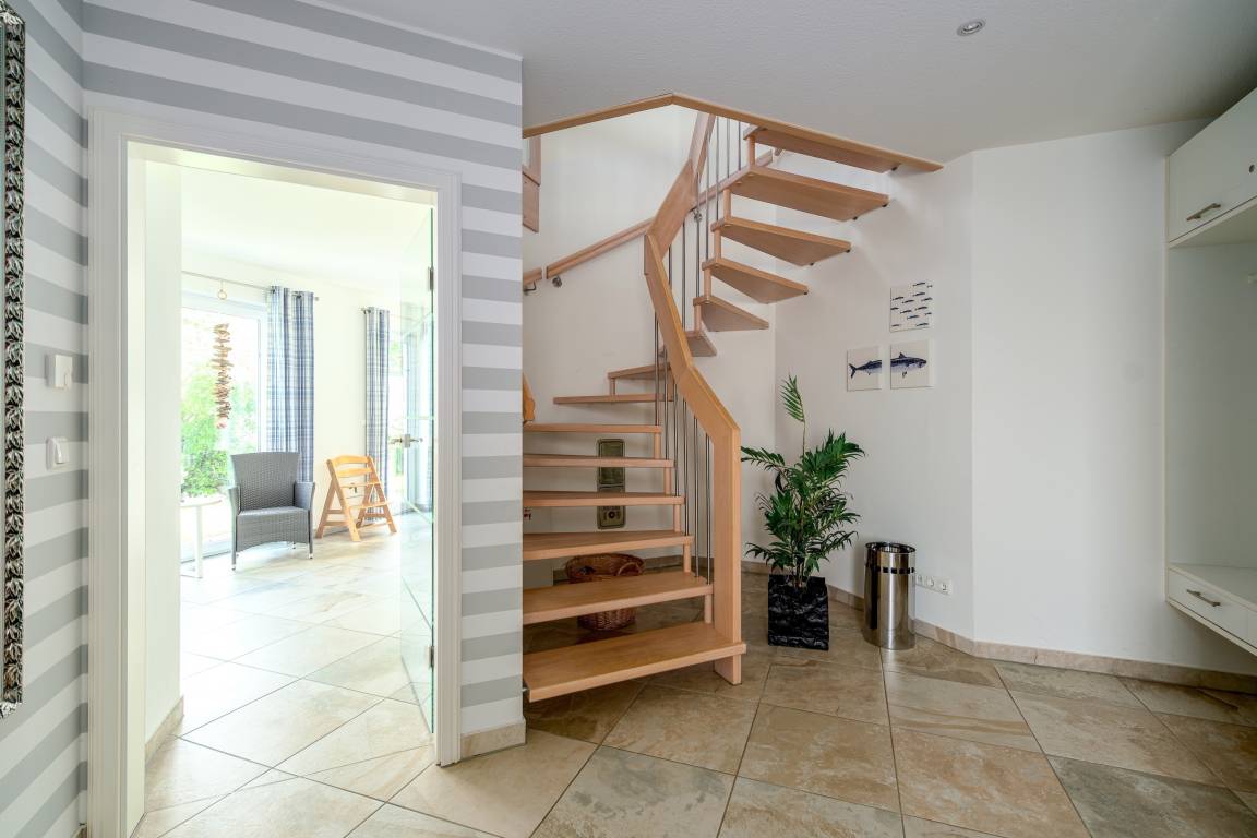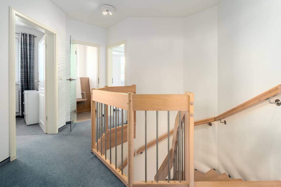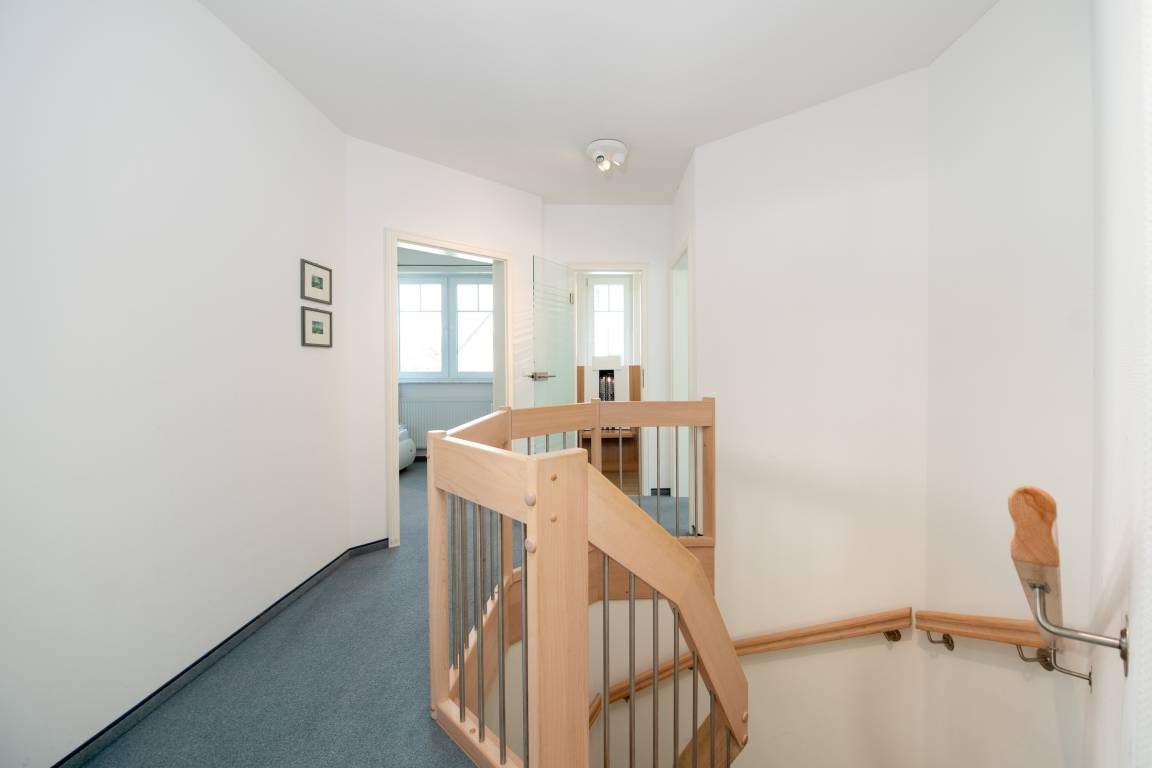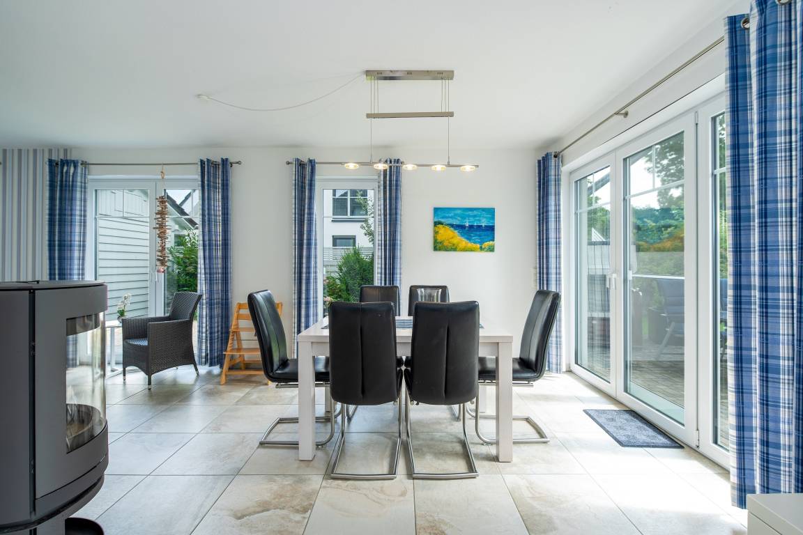 Das Haus erstreckt sich über zwei Etagen und empfängt Sie mit einem großzügigen, hellen Eingangsbereich, Garderobe, Abstellraum und Gäste-WC. Über eine Glastür gelangen Sie in den offenen Wohn- und Kochbereich. Die große, U-förmige Küche ist voll ausgestattet – vom Cerankochfeld über Geschirrspüler bis zur Kaffeemaschine – und lädt zum gemeinsamen Kochen ein.