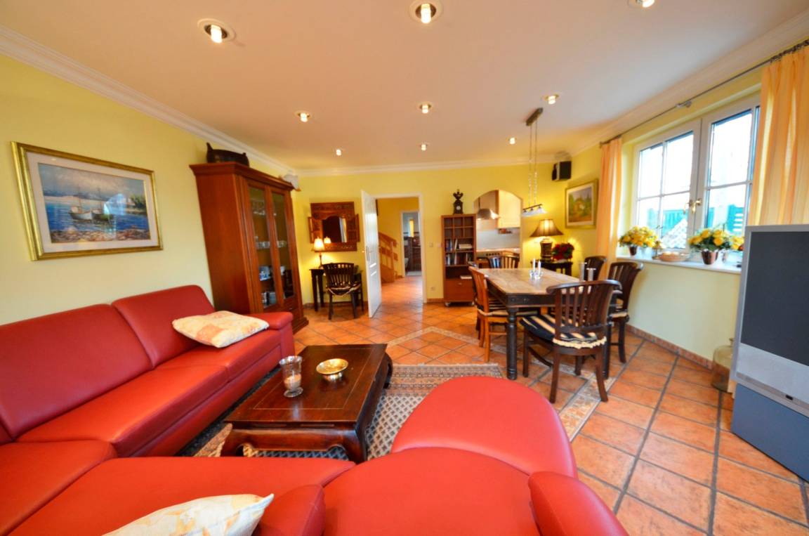 Wohn- Esszimmer mit Fußbodenheizung, Ausgang zur Terrasse. Schöne Couch-Garnitur und Opiumtisch, Telefon, 150cm - Flachbild - TV mit ca. 40Programmen, Stereo / CD, Speisetafel mit 6 Stühlen, Geschirrschrank, Telefontisch mit balinesischem Spiegel, Kinderhochstuhl, Wände dekoriert mit Bildern, dekorative Beleuchtung, Garten mit Terrasse und Gartenmöbeln, Liegen, Gartengrill.