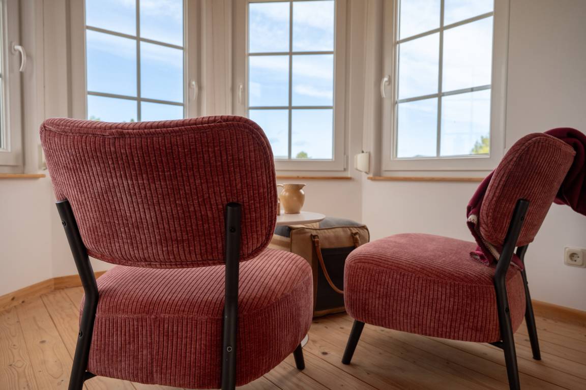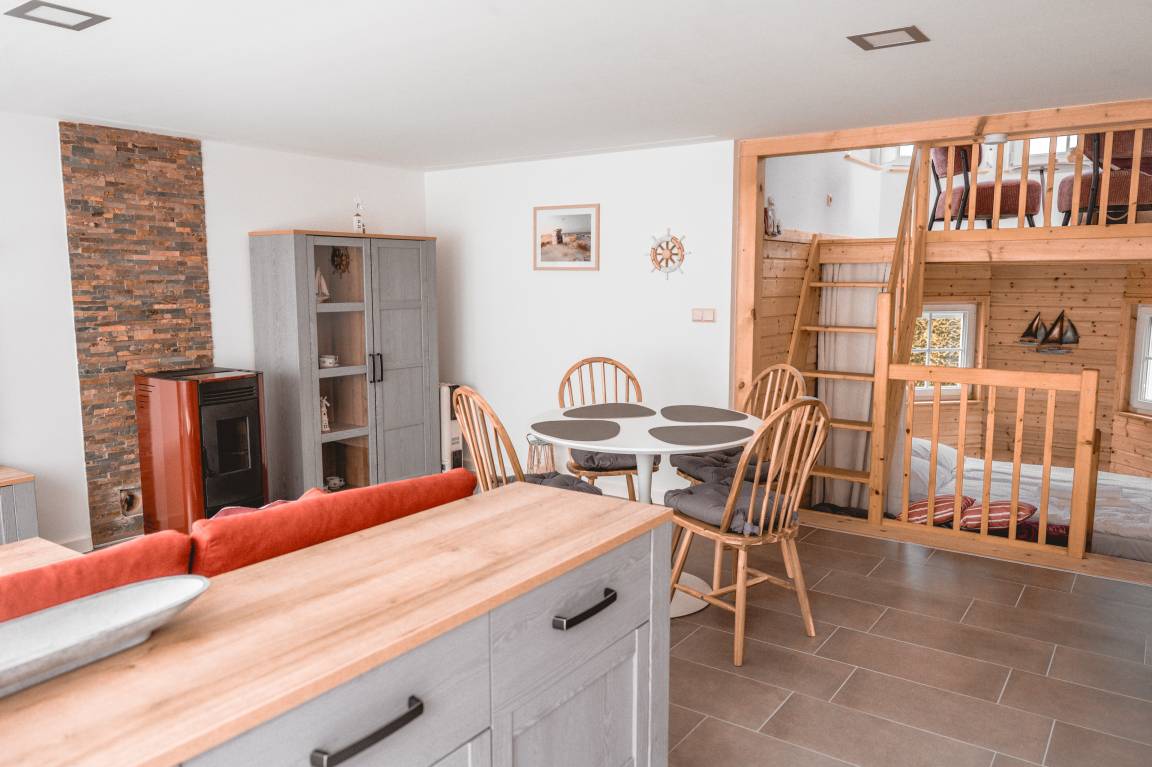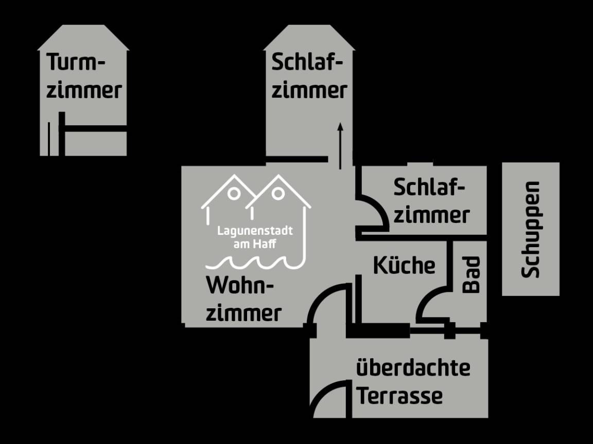 Der Bungalow bietet Platz für bis zu vier Personen und heißt auch Ihre vierbeinigen Freunde herzlich willkommen. Es stehen zwei Schlafzimmer zur Verfügung. Das Schlafzimmer im unteren Turm schafft eine ganz besondere Atmosphäre, während der obere Turm ein perfekter Ort zum Entspannen und Staunen ist - mit seiner gemütlichen Sitzgruppe und der wunderbaren Aussicht auf das Haff und die Siedlung wird es schnell zu Ihrem Lieblingsort. Das zweite separate Schlafzimmer bietet einen gemütlichen Rückzugsort mit viel Privatsphäre – ideal für erholsame Nächte nach einem Tag am Haff. Das offene Wohn- und Esszimmer mit großer Fensterfront schafft eine helle, freundliche Atmosphäre und lädt zum Entspannen ein.