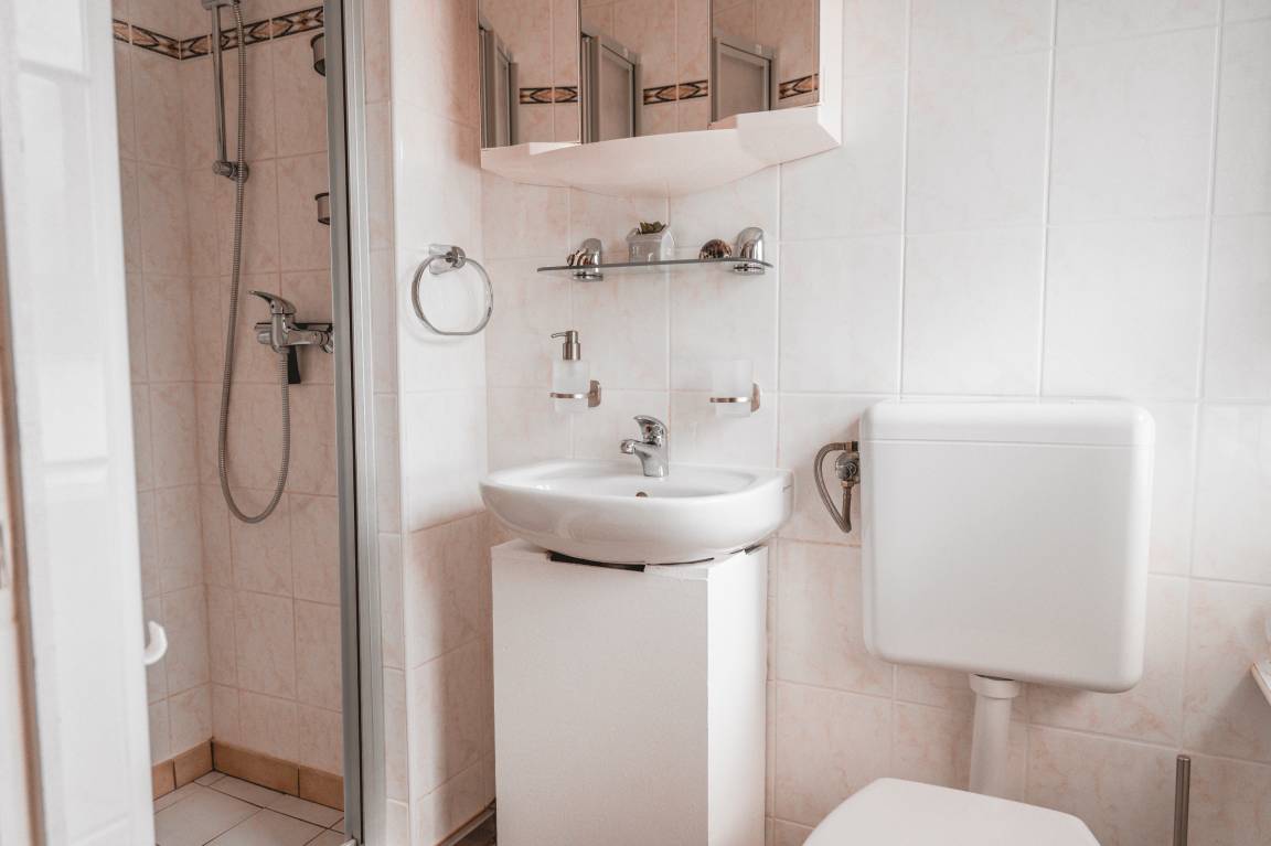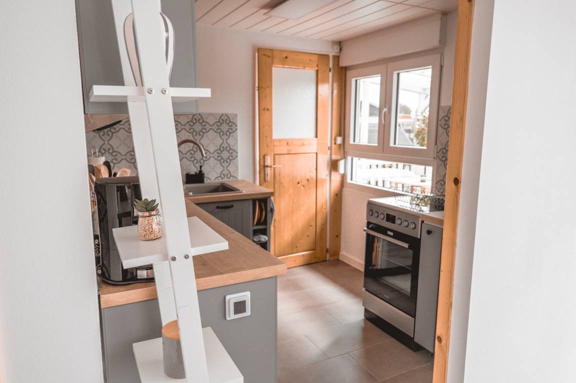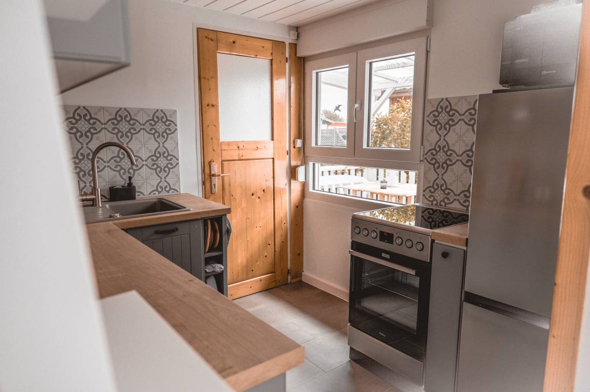Die voll ausgestattete Küche lässt keine Wünsche offen: Hier finden Sie alles, was Sie für einen erholsamen Urlaub benötigen – vom Kühlschrank mit Gefrierfach über einen Backofen mit Herd bis hin zu kleinen Helfern wie Kaffeemaschine, Toaster und Eierkocher. Im kompakten Badezimmer stehen Ihnen eine Dusche, Ablageflächen und ein Föhn zur Verfügung. In der Siedlung steht Ihnen ein eigener Waschraum zur Verfügung, ausgestattet mit Waschmaschine und Trockner – ideal für einen komfortablen und unabhängigen Aufenthalt.