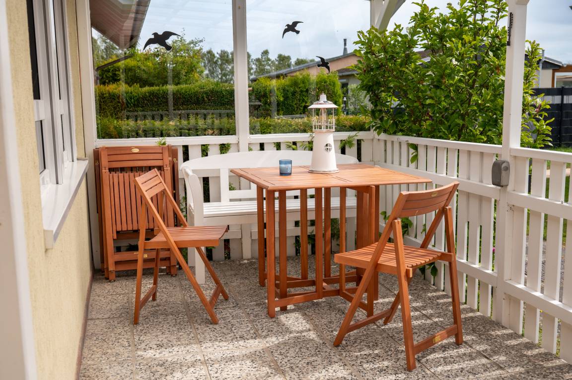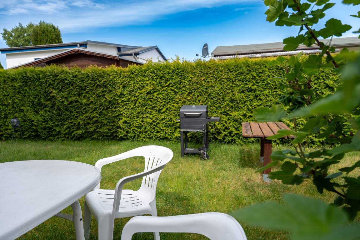 Nur etwa 100 Meter trennen Sie von der siedlungseigenen Badestelle und dem kleinen Hafen, wo das Wasser auf Sie wartet. Ein entspannter Spaziergang auf den Dünen führt Sie in etwa 800 Metern zum großen Yachthafen und zum wunderschönen Sandstrand von Mönkebude. Verbringen Sie entspannte Stunden im Garten oder genießen Sie die Morgenstunden auf der großzügigen Terrasse. Die Terrasse ist vollständig verschließbar, sodass Kinder und Hunde sicher spielen können, während Sie ungestört entspannen.