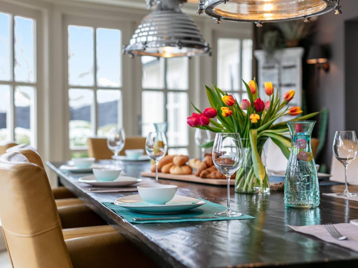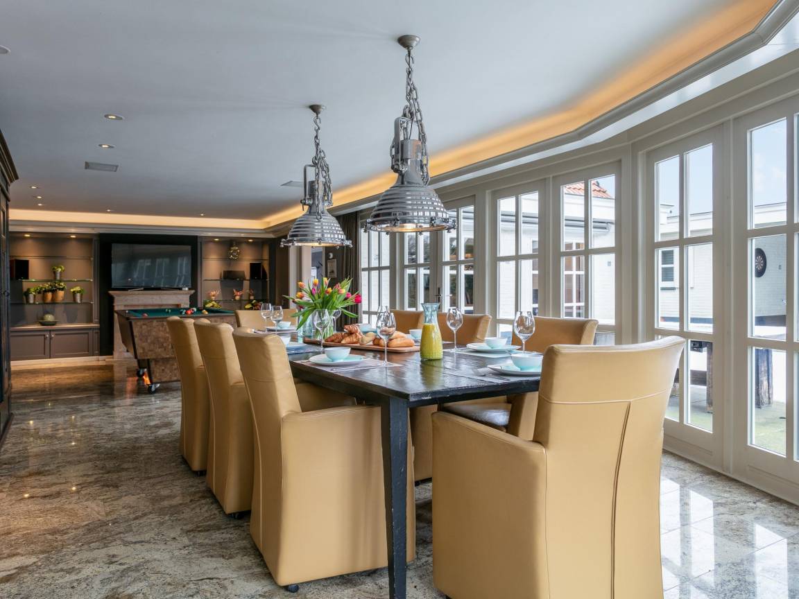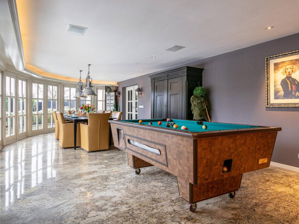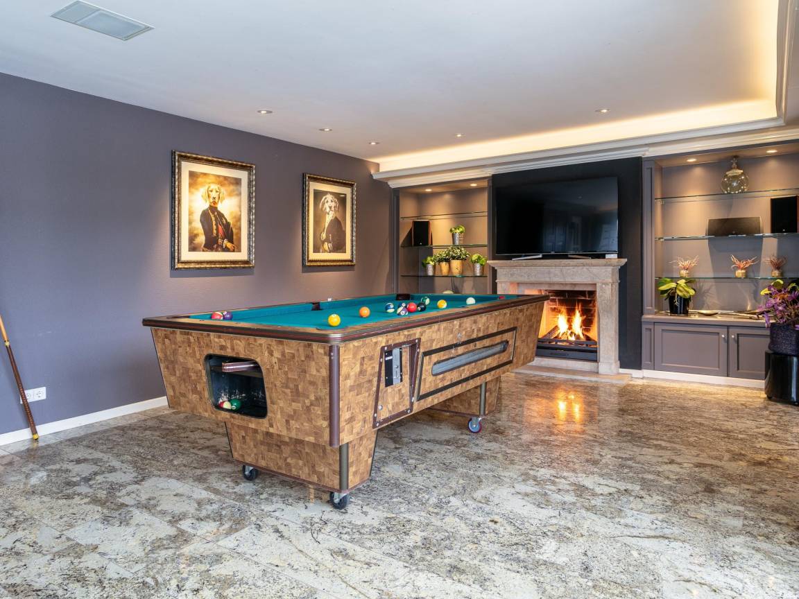 Layout : Parterre: Wohnzimmer mit TV, Dekokamin, Sitzecke, Spielzeug , Esszimmer mit Esstisch(10 Personen) , Küche mit Toaster, Kochherd, Dunstabzugshaube, Kaffeemaschine(cups), Kaffeemaschine(pads), Backofen, Kombi-Mikrowelle, Geschirrspüler, Kühl-/Gefrierkombination , Schlafzimmer mit 3x Einzelbett , Freizeitraum mit Sitzecke, Billard , Toilette
