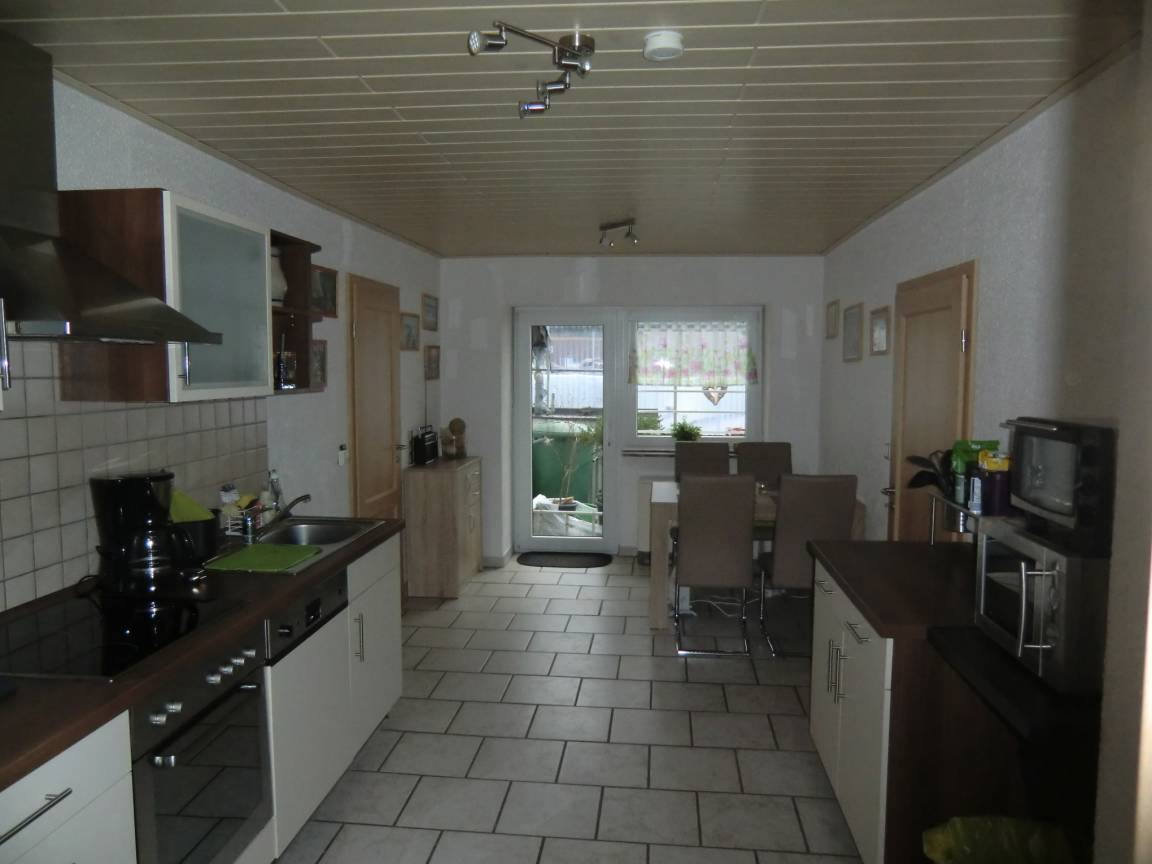 Große Küche komplett eingerichtet mit Essecke.