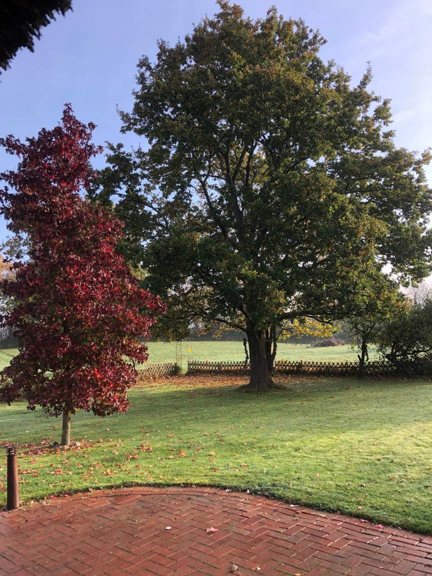 Sie betreten im EG den gemütlichen Wohn/Essbereich mit Fußbodenheizung und gut sortierter Küche von wo Sie direkten Zugang zur großen Terrasse haben. Der Blick schweift über alte Obstbäume, Wiesen und Eichen unter denen es sich wunderbar in bequemen Liegestühlen träumen und entspannen lässt . Stockrosen, Mohn, Lavendel und Akeleien wachsen in üppiger Fülle rings ums Haus. Oft kommen in der Dämmerung Rehe und Fasan bis auf das Grundstück.