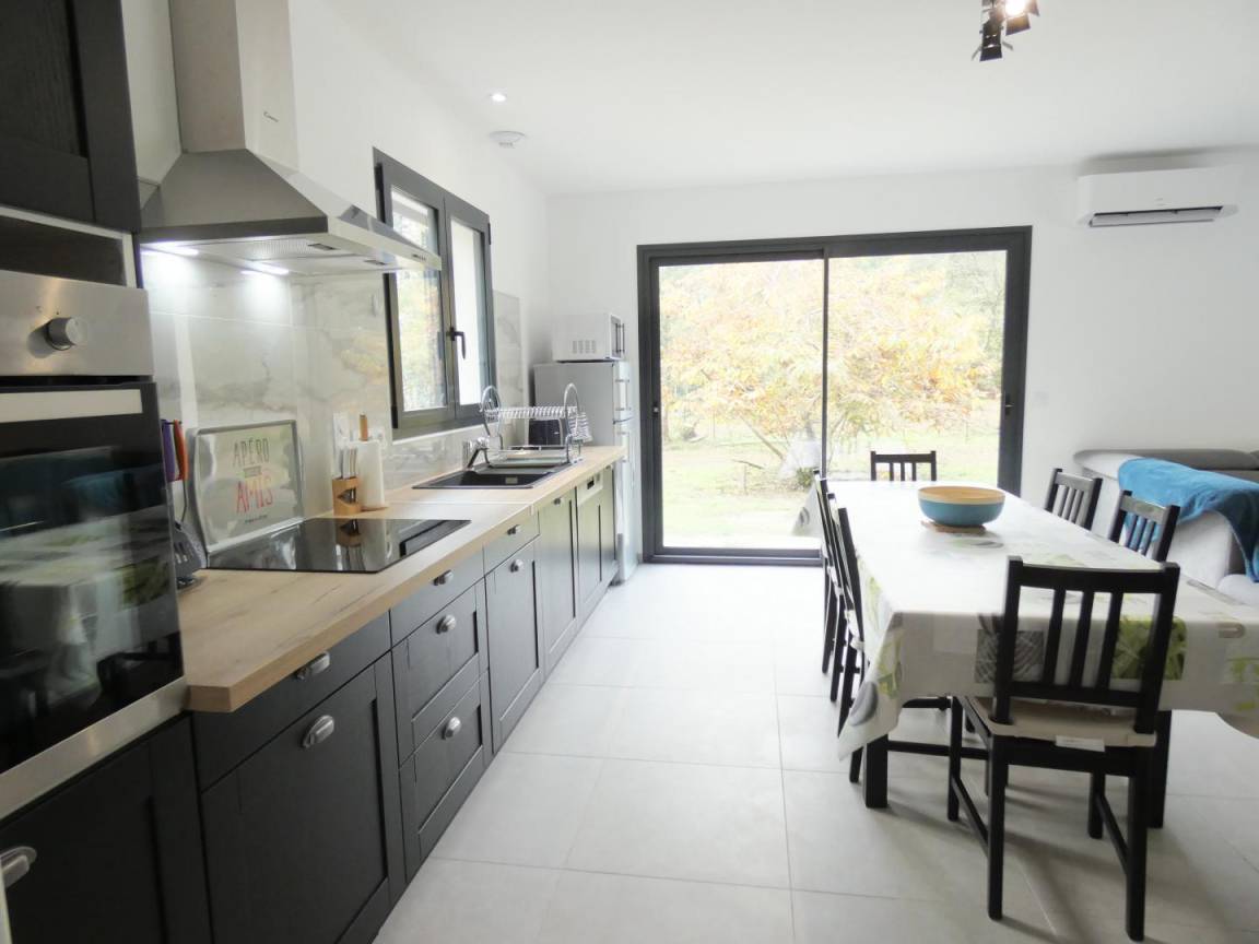Essbereich und offene ausgestattete Küche (3 Induktionskochfelder, Dunstabzugshaube, Geschirrspüler, Kühlschrank mit Gefrierfach, Elektroherd, Mikrowelle, 1 Filterkaffeemaschine und 1 Pad-Kaffeemaschine),