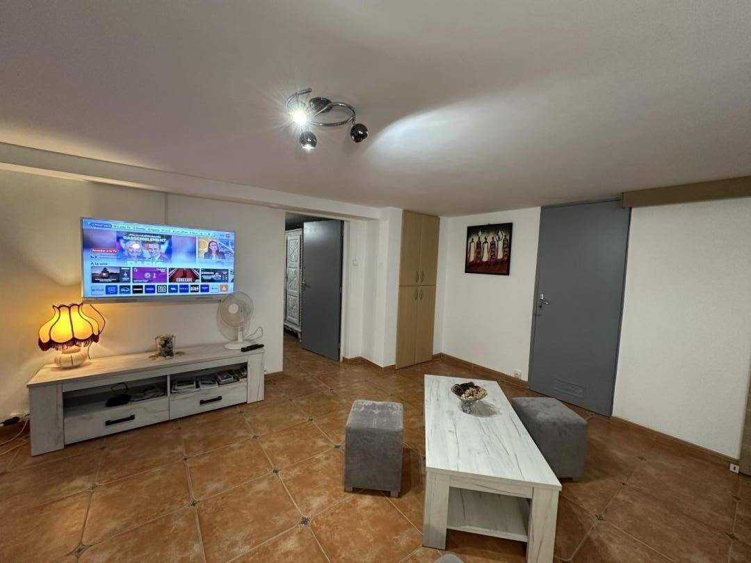 2 Stufen hinunter zum Wohnzimmer, Fernseher, WLAN-Anschluss,