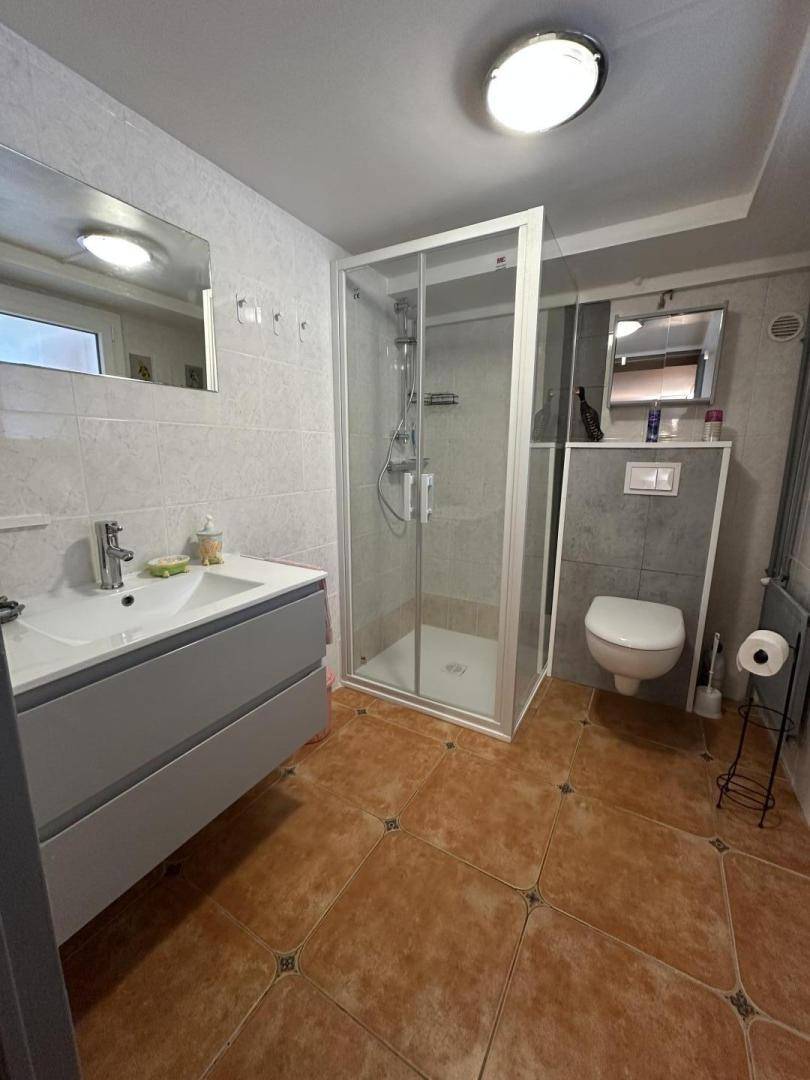 Badezimmer mit Dusche und Toilette.