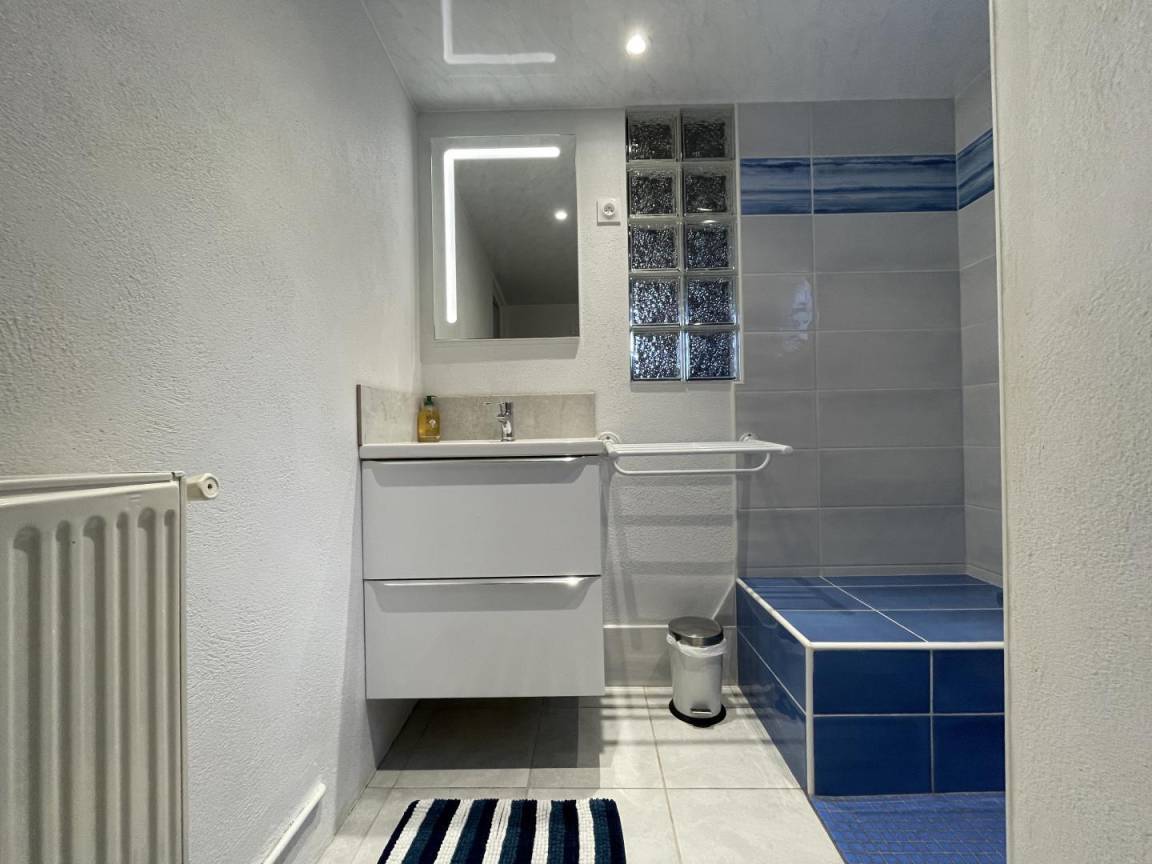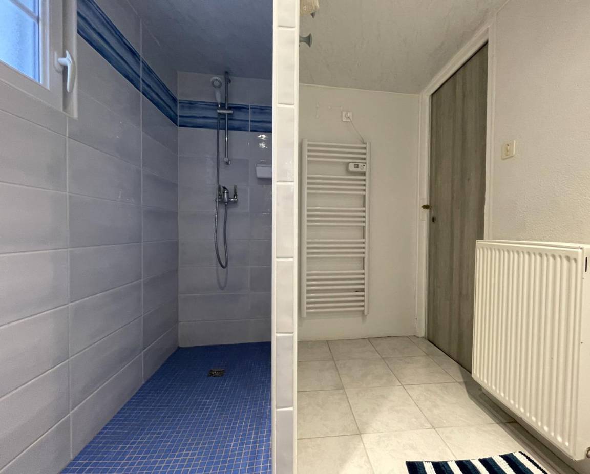- Duschraum (ebenerdige Dusche, Waschbecken) und separate Toilette (Deckenhöhe 2 Meter für diese beiden Sanitärräume). Keller (Waschmaschine).