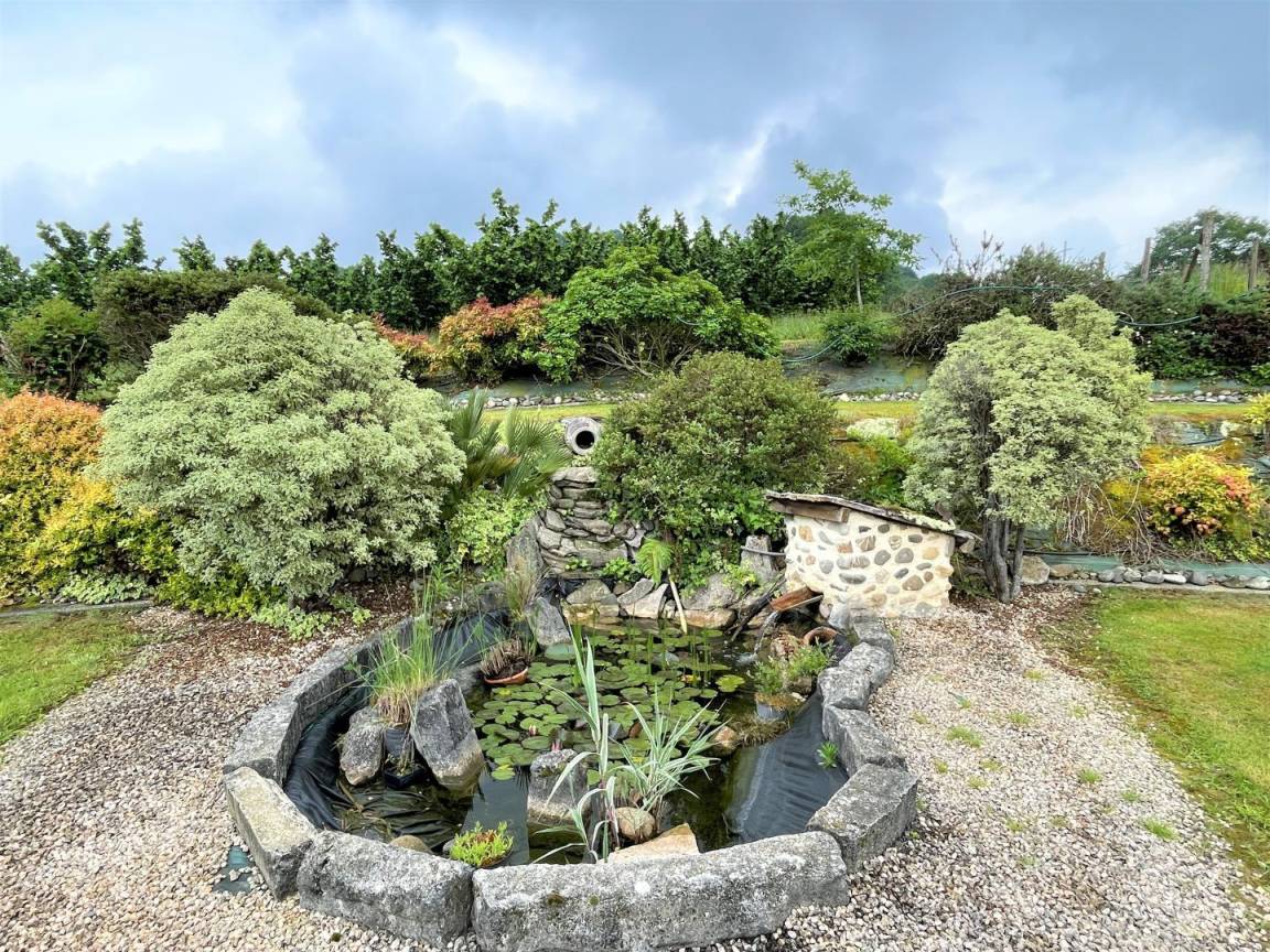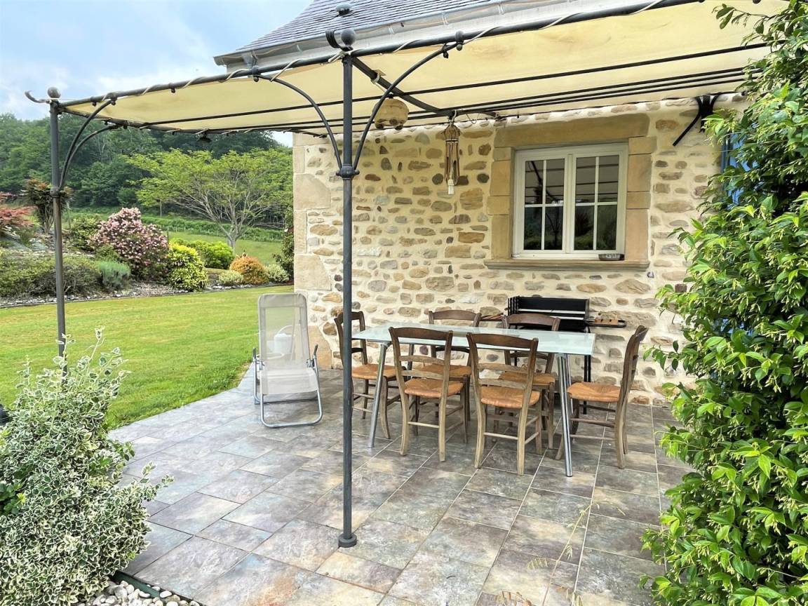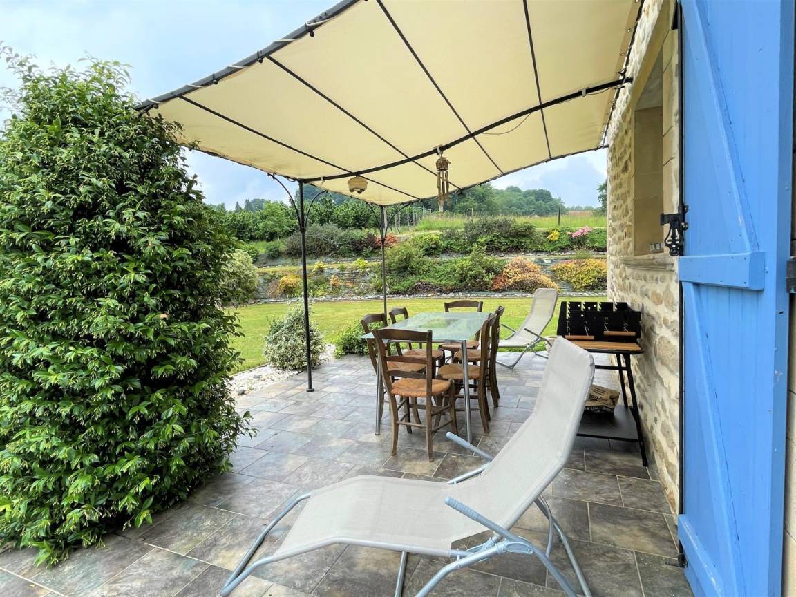 Überdachte Südterrasse mit Blick auf den Blumengarten und seinen Brunnen, Gartenmöbel, Grill. 2 Liegestühle.