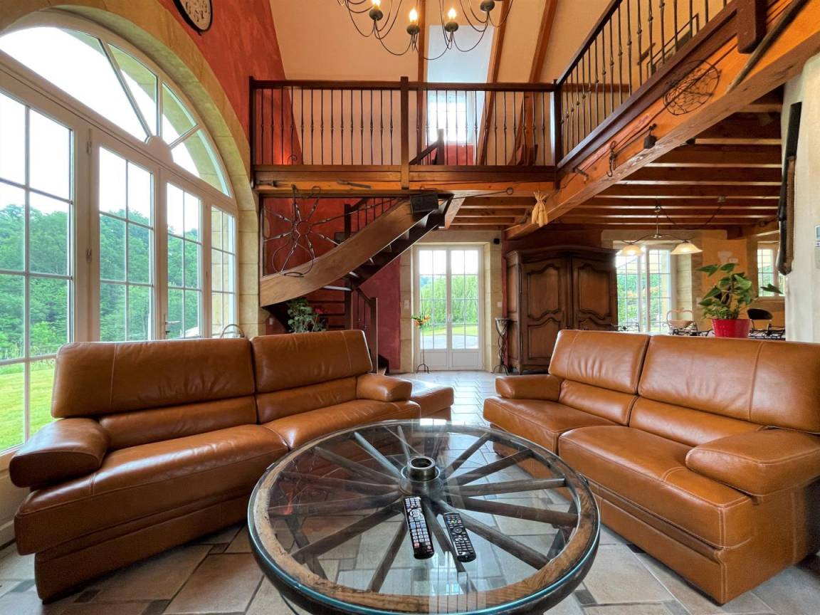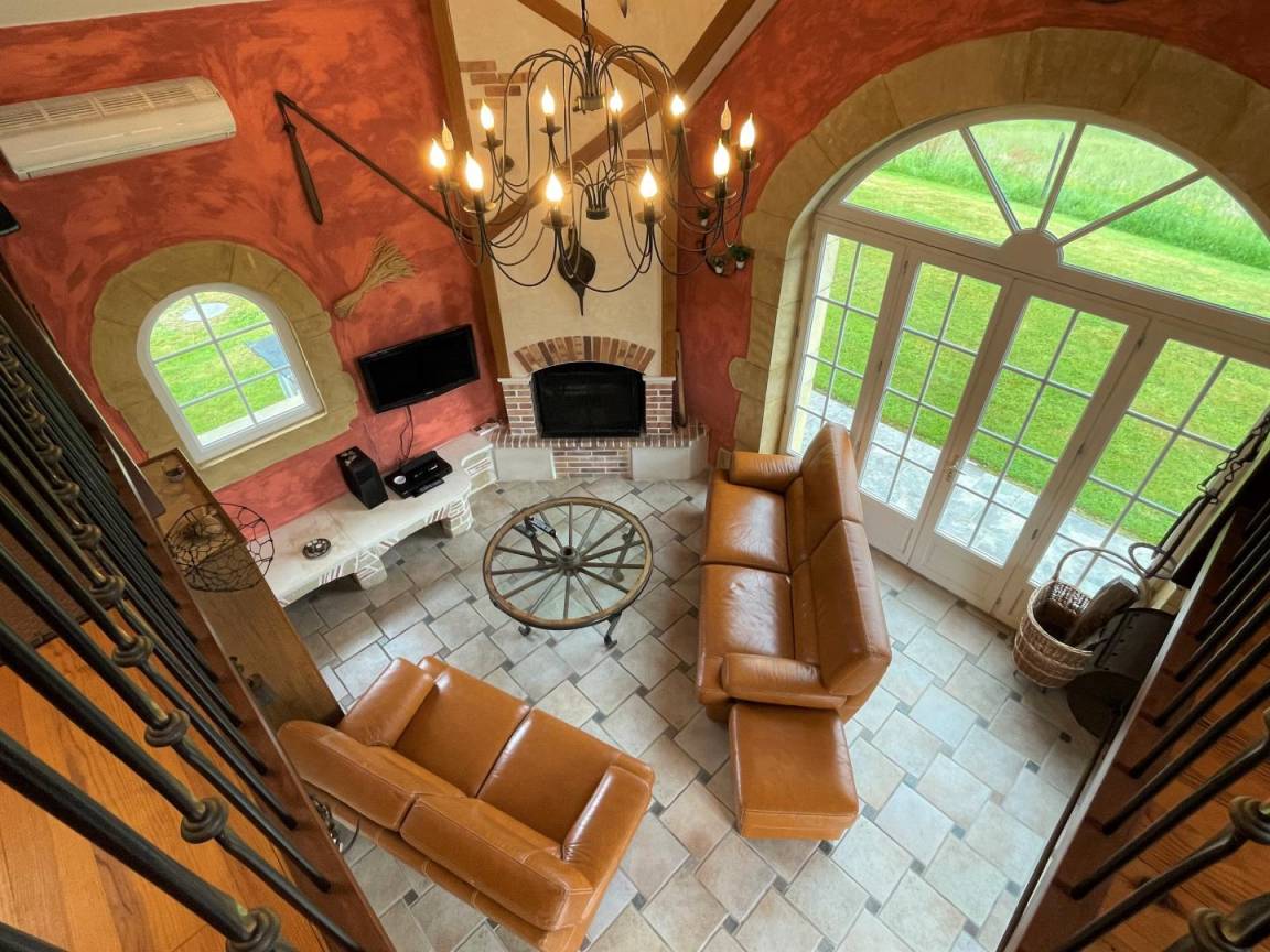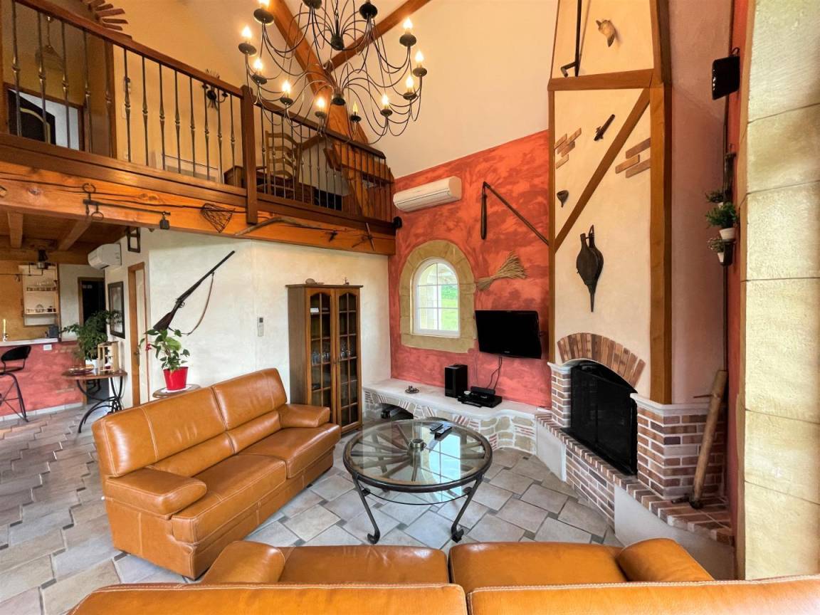 - Wohnzimmer: offener Kamin, TV, Sofas. WIFI-Internetbox. DVD-Player und kleine HiFi-Anlage.